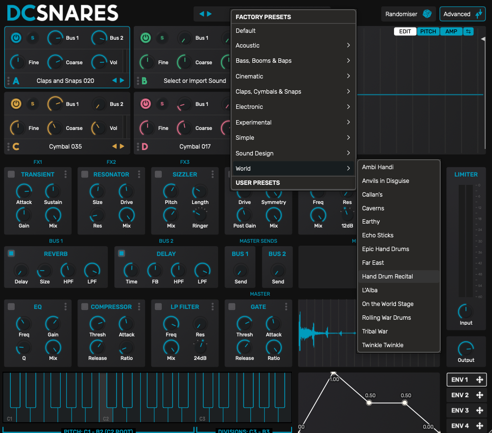 DC Snares는 기본 상태에서도 얼마든지 스네어를 섞고 톤을 조절하고, 파형을 다듬어 원하는 느낌으로 레이어링할 수 있다. 하지만 트랜지언트 컨트롤이라던가 하이패스 등 이펙터를 적용하여 더욱 심화 작업을 하고 싶은 분들을 위해 DC Snares는 우측 상단에 Advanced 버튼을 마련해 두었다. Advanced 모드를 활성화하면 숨겨져 있던 기능들이 우르르 튀어나오는데, DC Snares의 무기들이 다 여기에 숨겨져 있다. 스네어 하나에 이렇게 진심으로 대하는 악기는 살면서 처음 봤다.