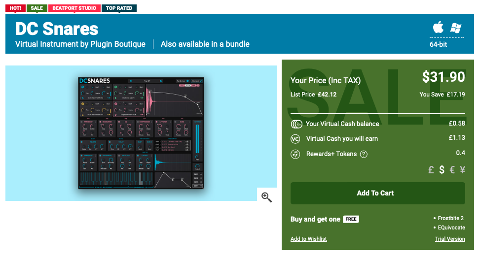 Plugin Boutique DC Snares 구매 링크 (PluginBoutique)를 클릭하거나, Plugin Boutique(링크)에 접속한 후, 검색창에 " Plugin Boutique DC Snares"를 검색하면 위와 같은 화면이 나타난다. Plugin Boutique는 회원 가입을 하지 않아도 상품 구매가 가능하지만, 회원 가입을 하는 편이 추후 라이센스 관리에 용이하다. 기본값은 파운드화로 나타나지만 달러나 엔, 유로화로 가격을 바꿔가며 확인할 수 있다. 다만, 대한민국 원은 지원하지 않으므로 해외 결제가 지원되는 카드나 페이팔 계정을 미리 준비할 필요가 있다. Add to Cart를 클릭하여 상품을 내 장바구니로 담자.