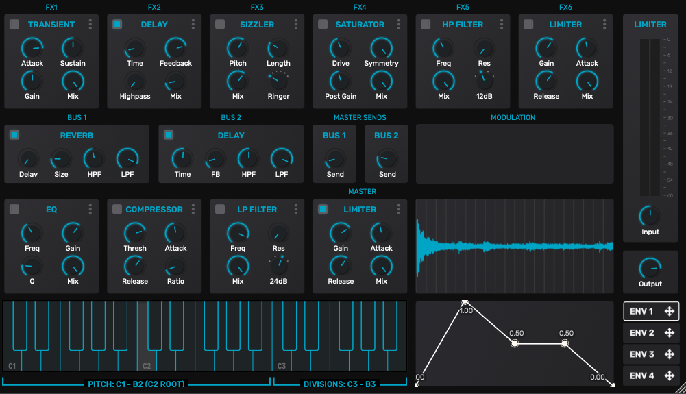 Advanced 모드에서는 FX단의 조절과 Bus단에 걸린 리버브와 딜레이, 마스터 이펙터, 그리고 모듈레이션 엔벨롭 등을 설정할 수 있다. Serum을 다뤄본 경험이 있는 분이라면 단번에 이해할 수 있는 구조다. FX는 총 6개를 걸 수 있고, 12개의 이펙터가 준비되어 있다. 꽤 다양한 이펙터들이 내장되어 있어 이미 가공된 톤을 더욱 독특하게 만들어낼 수 있다. 마스터 FX는 개별 FX와 달리 4개만 사용할 수 있지만, 12개의 이펙터를 공유한다. 즉, 각 스네어에 건 이펙터들을 마스터 FX에서 한번 더 쓸 수 있다. 엔벨롭 커브는 총 4개까지 제공이 되는데, 우측의 Env 옆의 화살표를 매핑하고 싶은 노브에 드래그하면 자동으로 매핑이 된다. 모듈레이션 섹션에서 어느 노브에 어떤 엔벨롭이 몇 퍼센트로 걸렸는지 확인 및 조작할 수 있다.