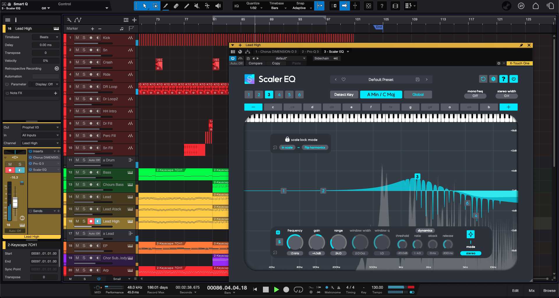 위 사진과 같이 바뀐다. 사진만 보고 눈치챈 분들도 있겠지만 Scaler EQ는 평범한 EQ가 아니다. 바로 다이나믹 EQ다. 평범하게 밴드 조절을 하다가 특정 주파수가 세게 튀어나올 때 누르고 싶다면 우측의 Dynamic을 클릭해 다이나믹 EQ로 사용하면 된다.