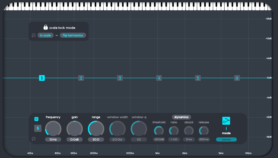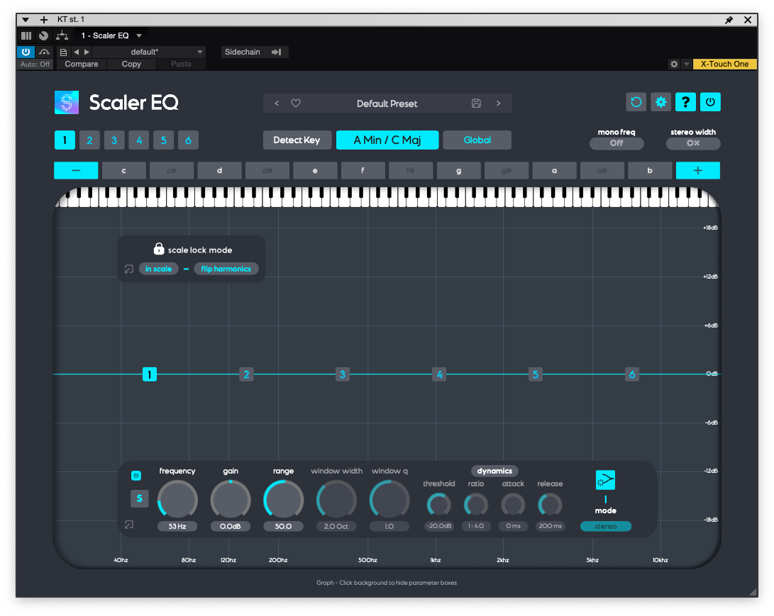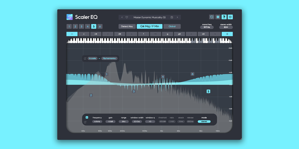 그럼 새로운 EQ, Scaler EQ의 특징을 차근차근 살펴보자. 크게 상단부와 하단부로 나눌 수 있다. 상단부에는 Scaler EQ의 핵심 기능, Scale 기능이 가장 먼저 눈에 들어온다. 설정한 음원의 음계에 맞춰 알맞은 배음을 부스트 하거나 컷 할 수 있는 Scale 기능은 가운데에서 살펴볼 수 있는데, 좌측에는 자동 키 설정, 현재 설정된 키 음계, 그리고 모든 EQ 밴드에 설정할 것인지를 설정할 수 있는 Global 기능이 있다. 그 좌측에는 총 6개의 EQ 밴드 중 어떤 밴드가 선택되었는지 보여주는 인디케이터가 있고, 최우측에는 모노 주파수 대역 및 스테레오 주파수 대역을 설정할 수 있는 페이더가 있다.