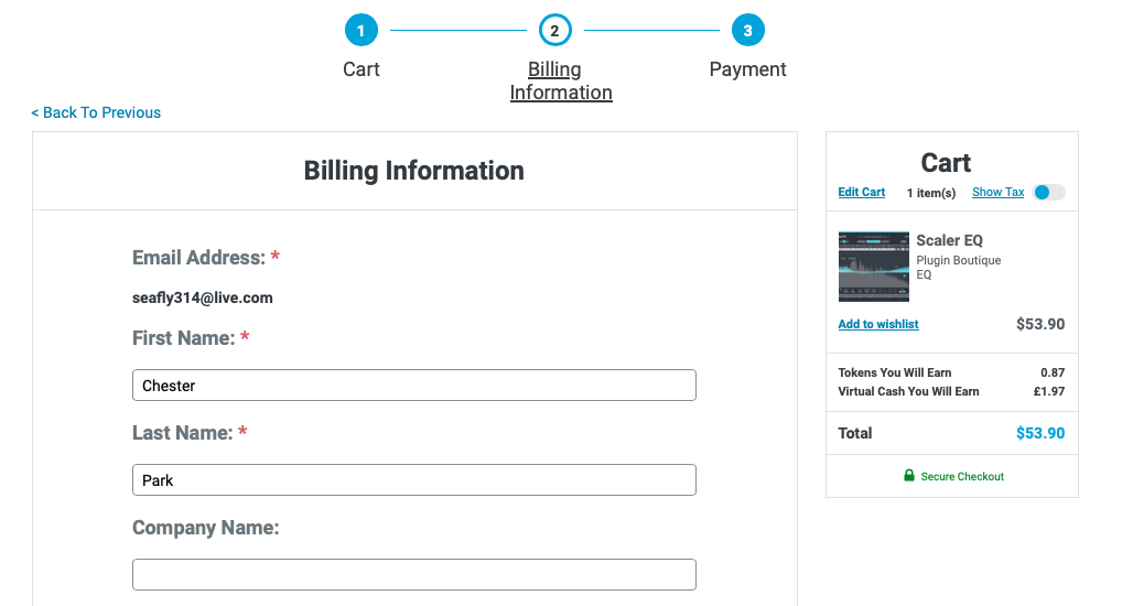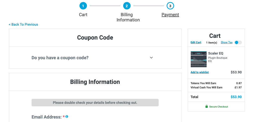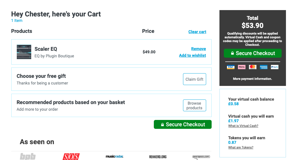 홈페이지 상단 우측에 자리 잡은 Cart를 누르면 다음과 같은 화면이 나타난다. 이 화면에서는 이번 구매로 적립되는 캐시, 구매로 적립되는 토큰을 확인할 수 있으며 상품 구매로 받을 수 있는 무료 선물을 선택할 수 있다. 만일 Plugin Boutique에서 처음 구매한다면 Claim Gift를 클릭해서 무료 선물을 받아가는 게 좋다. 플러그인 하나만 샀을 뿐인데 공짜로 다른 플러그인들도 가져갈 수 있다. 무료로 받을 수 있는 플러그인들은 기간에 따라 다르니 미리 구매 전에 어떤 걸 무료로 주는지 체크해 보는 것도 좋다. 모든 작업이 완료되었다면 초록색 "Secure Checkout"을 눌러 다음 화면으로 넘어가자.