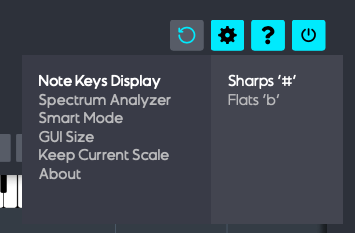 그 밖의 기능들은 우측 상단의 톱니바퀴 아이콘을 누르면 볼 수 있다. 스펙트럼 애널라이저를 볼 수 있는 기능이라던가 음계 표시를 # 혹은 b로 바꿔서 표시할 수도 있다. UI 크기가 너무 크다면 여기서 조절할 수도 있다. 여기서 "Smart Mode"라는 기능이 눈에 띄는데, Scaler EQ 필터의 정확성과 관련된 설정이다. 모드를 켜게 되면 필터의 정확성이 줄어들지만 EQ 필터를 통과하면서 소리가 바뀌는 정도가 과격하지 많아진다. 만일 EQing을 하는데 지나치게 날카롭고 인공적인 소리가 난다면 Smart Mode를 켜는 걸 추천한다. 반면, 사운드 디자인을 하는 분이라면 특유의 인공성 덕분에 Smart Mode를 자주 만지게 될 거라 확신한다.
