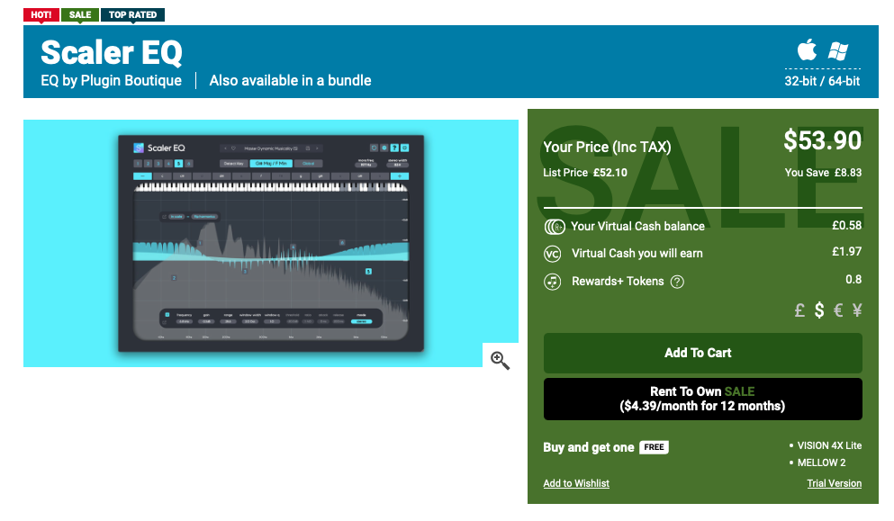 PluginBoutique Scaler EQ 구매 링크 (PluginBoutique)를 클릭하거나, Plugin Boutique(링크)에 접속한 후, 검색창에 " PluginBoutique Scaler EQ"를 검색하면 위와 같은 화면이 나타난다. Plugin Boutique는 회원 가입을 하지 않아도 상품 구매가 가능하지만, 회원 가입을 하는 편이 추후 라이센스 관리에 용이하다. 기본값은 파운드화로 나타나지만 달러나 엔, 유로화로 가격을 바꿔가며 확인할 수 있다. 다만, 대한민국 원은 지원하지 않으므로 해외 결제가 지원되는 카드나 페이팔 계정을 미리 준비할 필요가 있다. Add to Cart를 클릭하여 상품을 내 장바구니로 담자.
