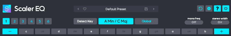 그럼 새로운 EQ, Scaler EQ의 특징을 차근차근 살펴보자. 크게 상단부와 하단부로 나눌 수 있다. 상단부에는 Scaler EQ의 핵심 기능, Scale 기능이 가장 먼저 눈에 들어온다. 설정한 음원의 음계에 맞춰 알맞은 배음을 부스트 하거나 컷 할 수 있는 Scale 기능은 가운데에서 살펴볼 수 있는데, 좌측에는 자동 키 설정, 현재 설정된 키 음계, 그리고 모든 EQ 밴드에 설정할 것인지를 설정할 수 있는 Global 기능이 있다. 그 좌측에는 총 6개의 EQ 밴드 중 어떤 밴드가 선택되었는지 보여주는 인디케이터가 있고, 최우측에는 모노 주파수 대역 및 스테레오 주파수 대역을 설정할 수 있는 페이더가 있다.