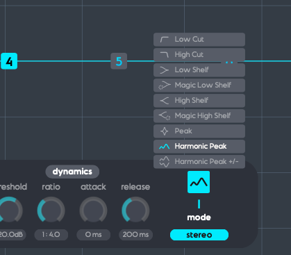 EQ 필터는 Scaler EQ의 꽃이다. Scaler EQ만의 Harmonic Peak 커브는 말할 것도 없고, 아날로그 장비의 EQ 필터 모양을 가져온 Magic Shelf, 그리고 다른 일반적인 EQ의 필터 모양도 지원하고 있어 범용성이 좋다. Harmonic Peak는 총 2가지의 옵션을 지원하는데, 부스트 혹은 컷으로 사용할 수 있는 일반 모드, 그리고 Harmonic Peak +/- 라 해서 해당 대역의 배음은 부스트하고, 나머지 부분은 컷을 하는 독특한 형태의 모드가 있다. 이건 꼭 써봐야 한다. 이런 EQ를 기존에는 본 적이 없다.