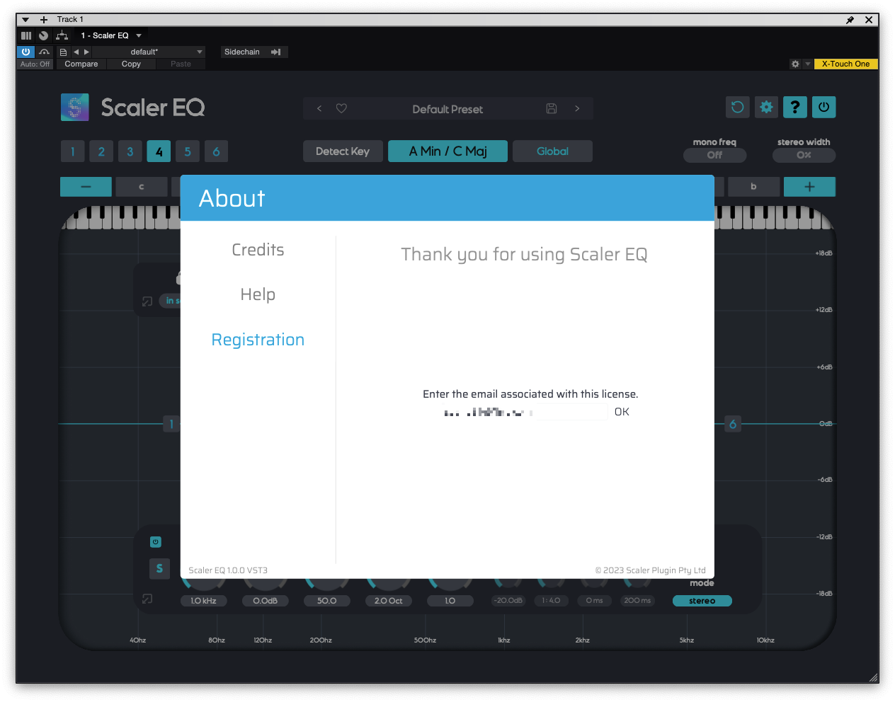 라이센스 파일을 등록하면 라이센스 파일에 등록된 이메일 주소를 입력하라는 메시지가 나온다. 이는 PluginBoutique의 계정 이메일 주소를 넣으면 된다. 이메일 주소를 넣고 OK 버튼을 누르면 이제 자유롭게 PluginBoutique Scaler EQ을 이용할 수 있다.
