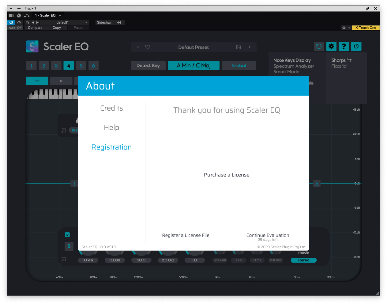 PluginBoutique Scaler EQ를 설치 후 처음 실행하게 되면 라이센스 키를 넣으라는 메시지가 나타난다. 여기에 라이센스 키를 넣게 되면 플러그인 인증이 완료되는 형태다. 라이센스 키를 넣지 않아도 30일 체험판을 선택하거나 데모 모드로 사용할 수 있지만 30초마다 1번씩 화이트 노이즈가 섞인다. 체험 목적이라면 30일 체험판을 선택하자.