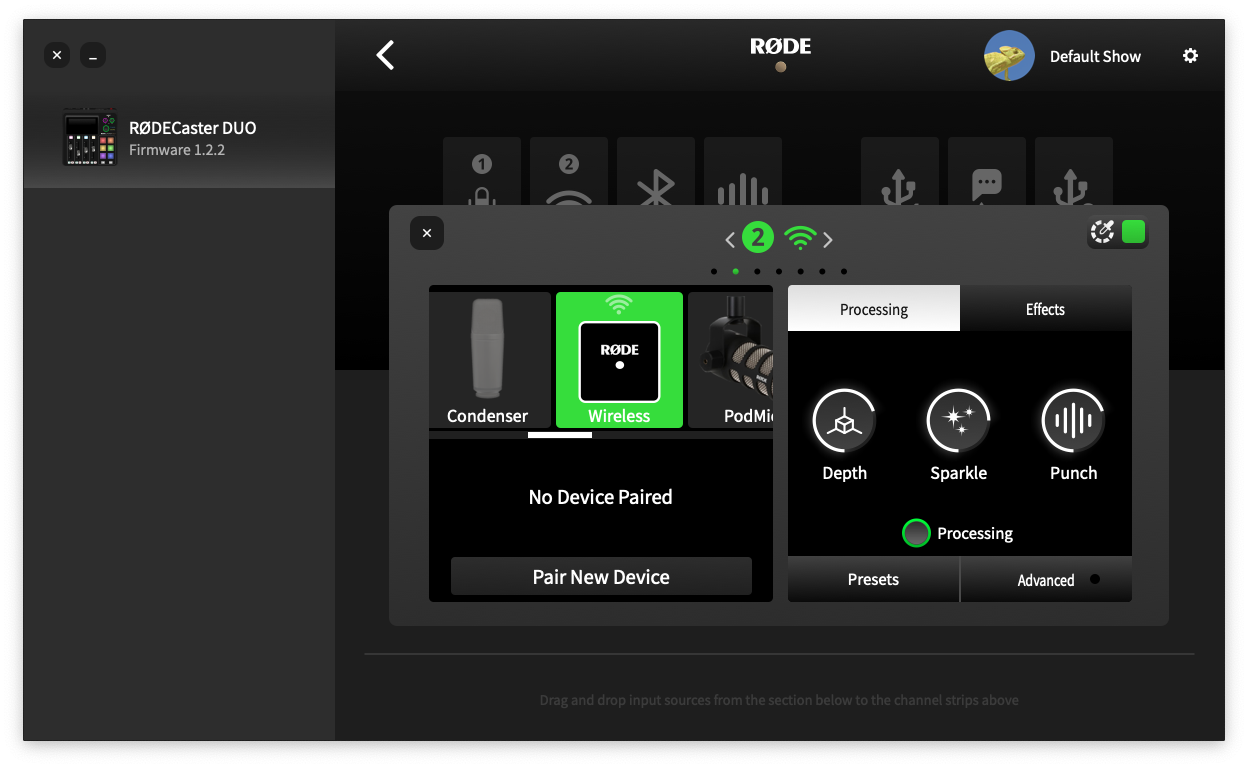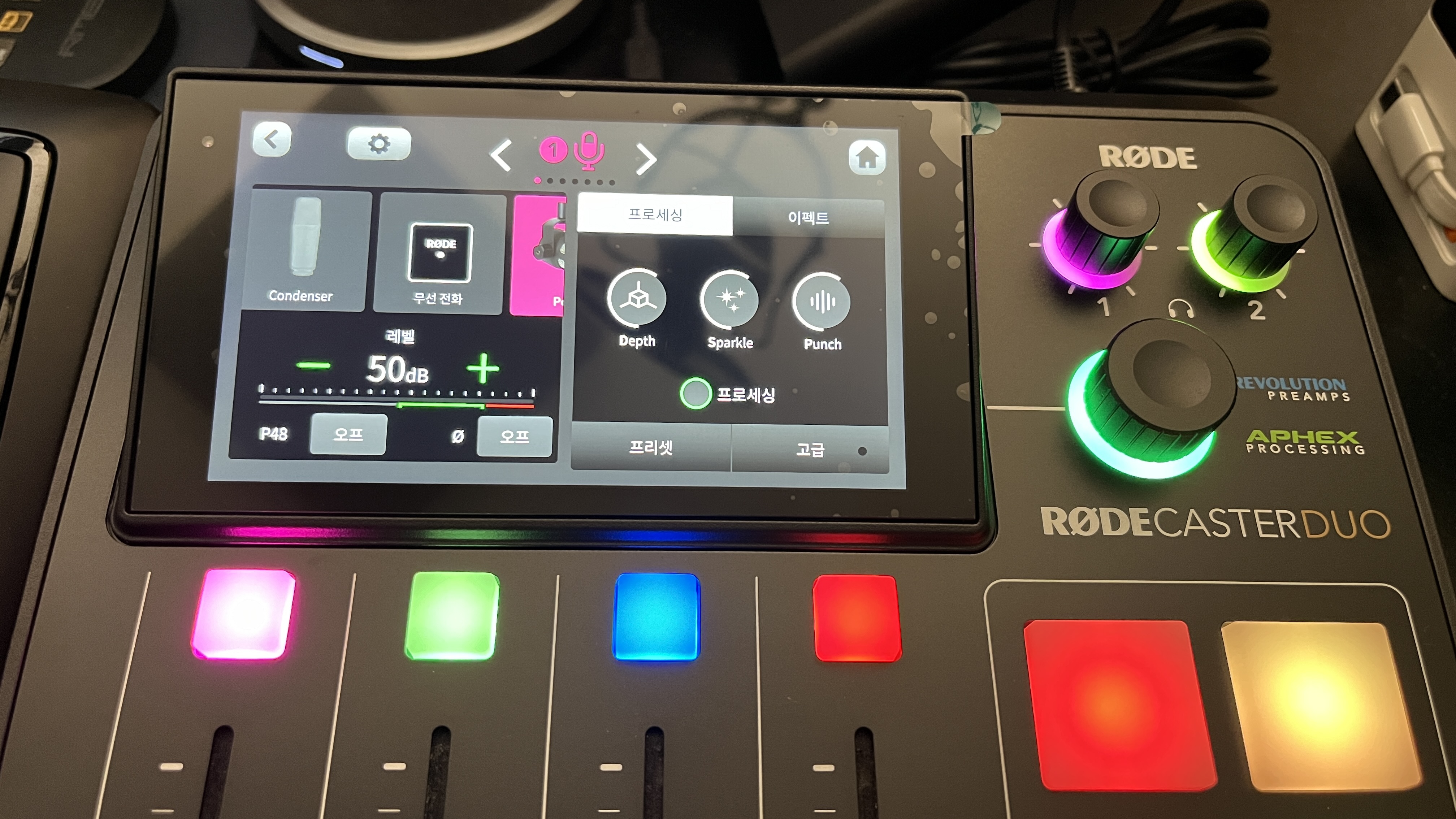 채널 하단의 아이콘을 누르거나 사진처럼 채널 위의 버튼을 누른다면 채널 설정으로 들어가게 된다. 위의 Quick Setup에서 본 마이크 종류 설정과 마이크 레벨값, 그리고 프로세싱 여부를 선택할 수 있다. RøDECaster Pro II와 달리 RøDECaster Duo의 마이크 설정 중 특이한 점이 하나 보인다. "무선 전화"라는 이름의 네모한 것이 하나 추가되어 있는데, 바로 RøDE의 Wireless Go 시리즈나 Wireless ME 등무선 마이크를 RøDECaster Duo에 연결해서 사용할 수 있다. 만일 작업하는 장비들이 RøDE로 채워진 경우라면 굉장히 유용하게 사용할 수 있을 듯하다.
