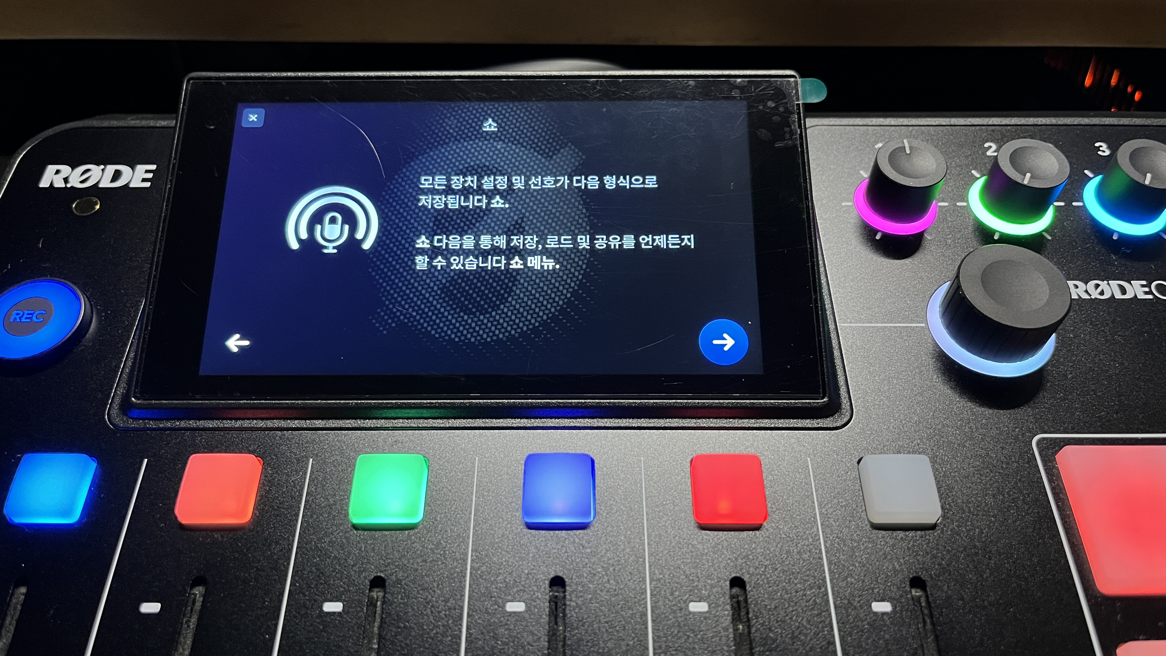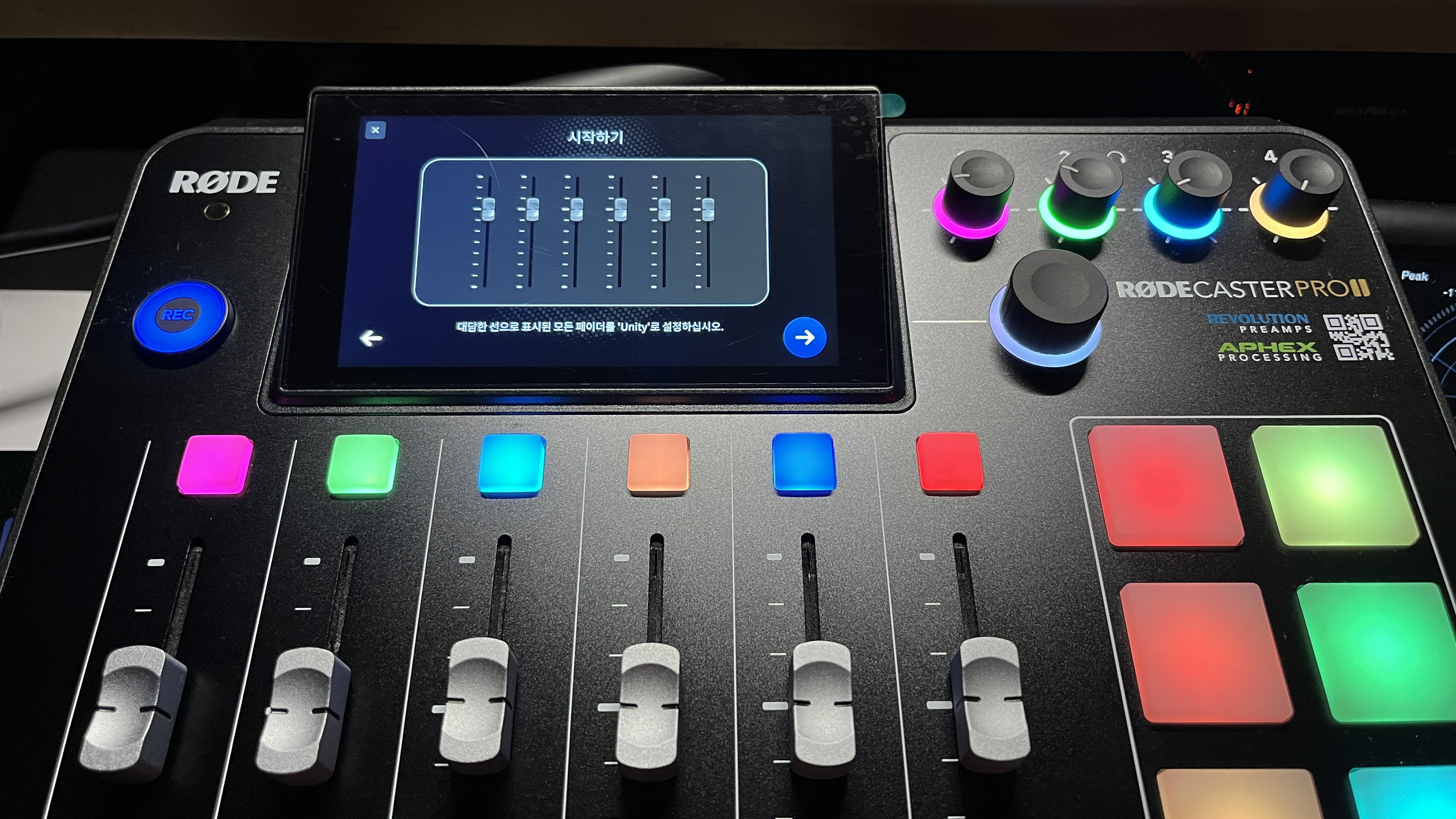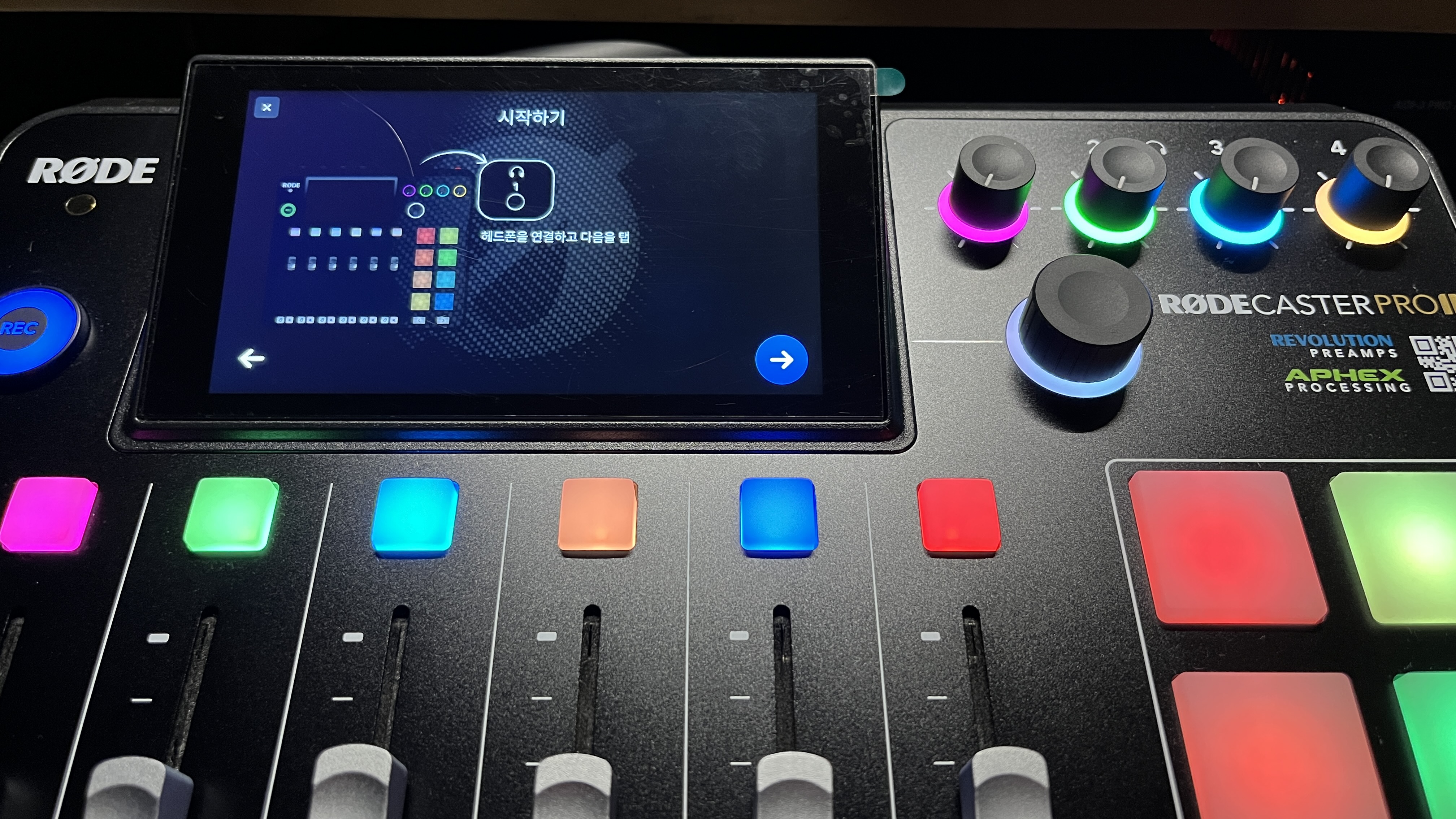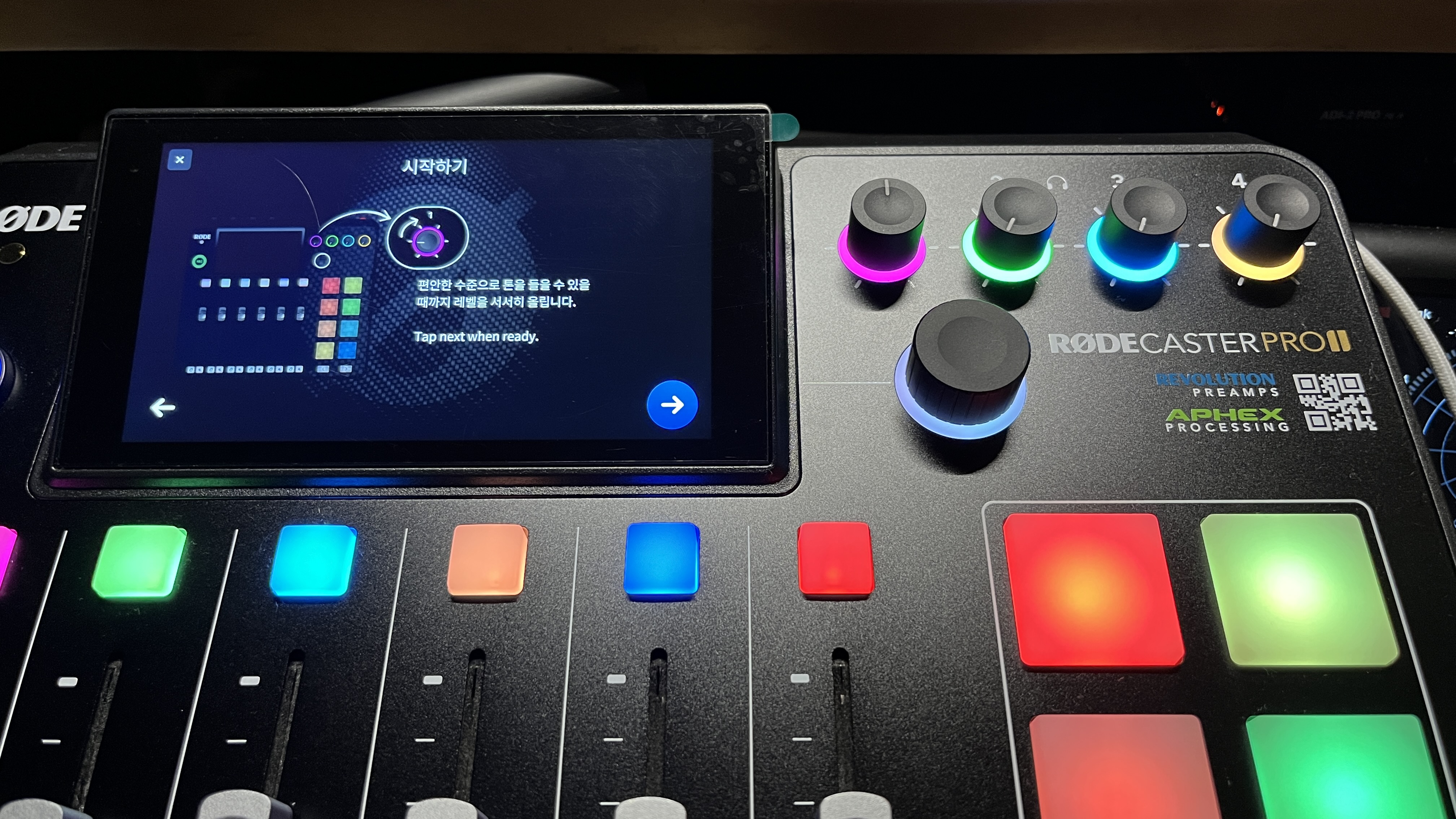 뒷면의 전원 버튼을 가볍게 누르면 약간의 로딩 후 "RøDECaster Duo"라는 글자가 나오며 초기 세팅이 시작된다. 이미 디지털 믹서를 많이 만져본 사람도 있겠지만, 처음 RøDECaster Duo로 디지털 믹서를 접하는 사람들도 있기에 이러한 세팅 과정은 중요하다고 생각한다.