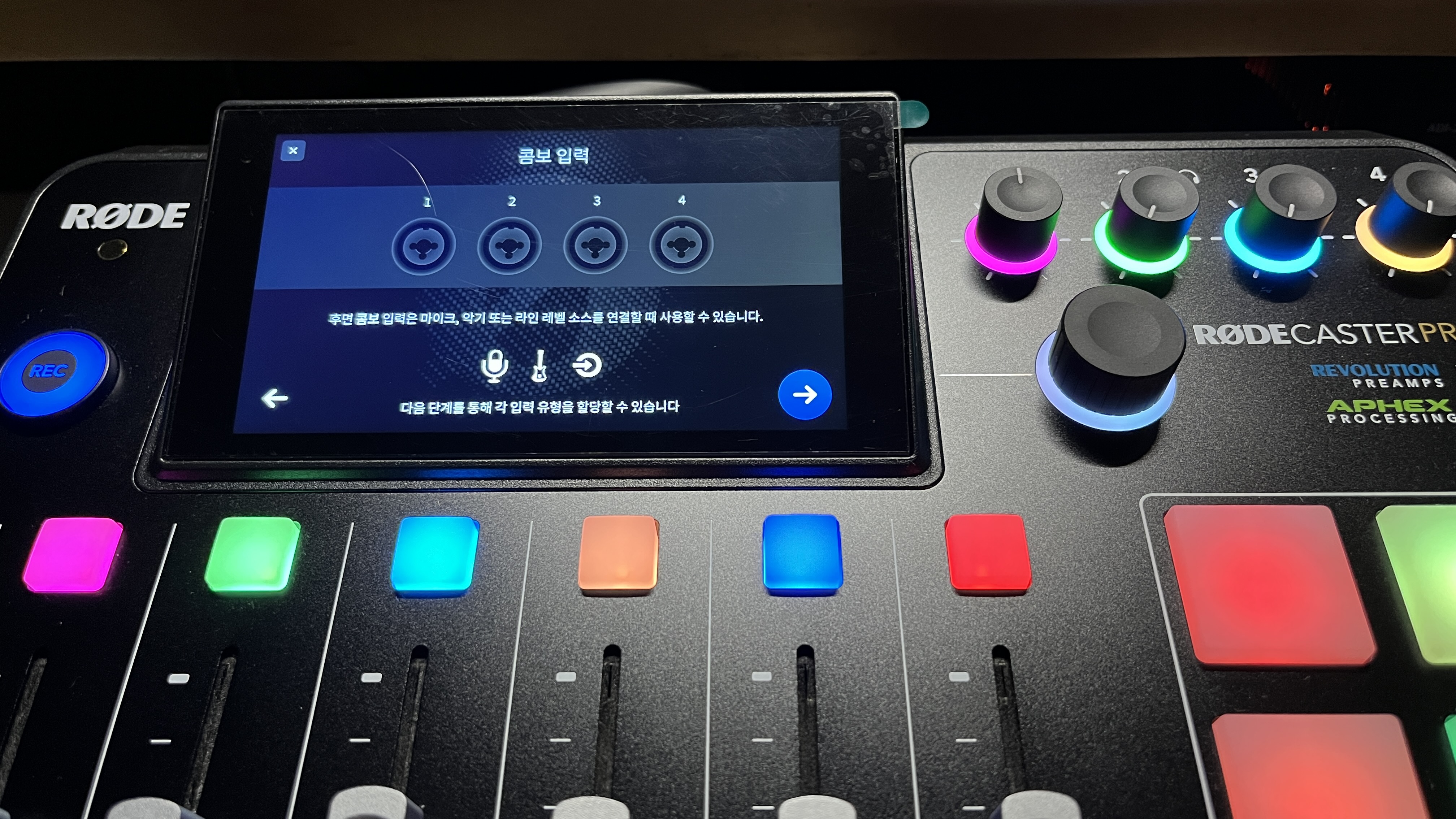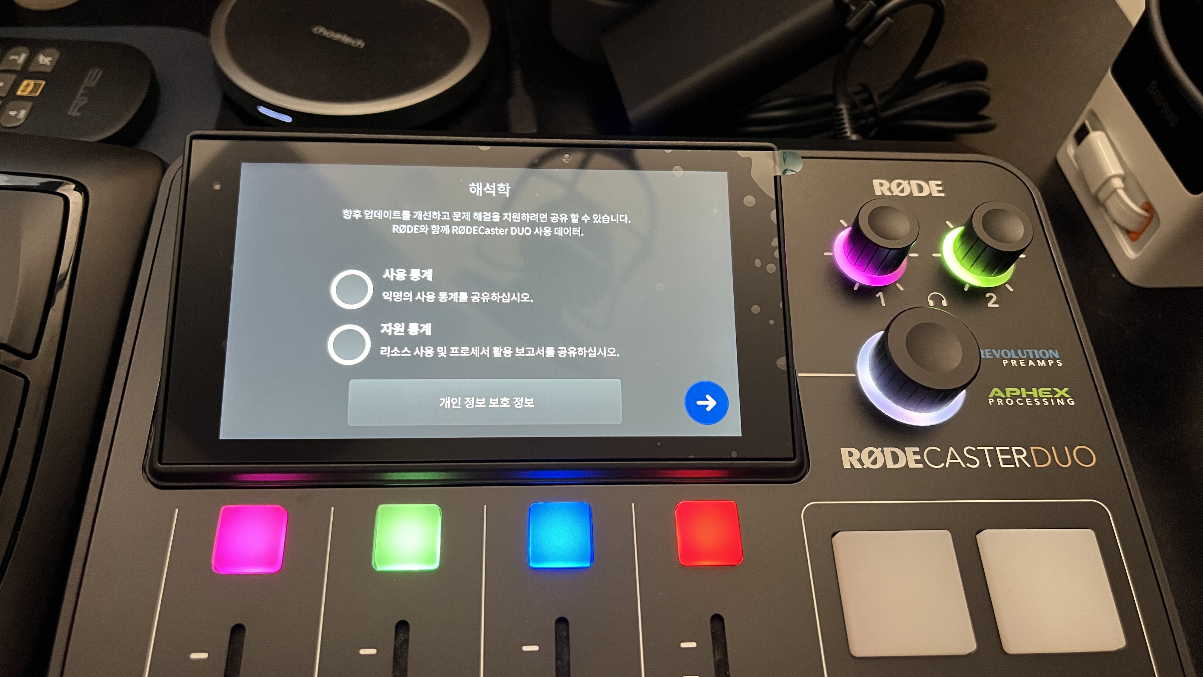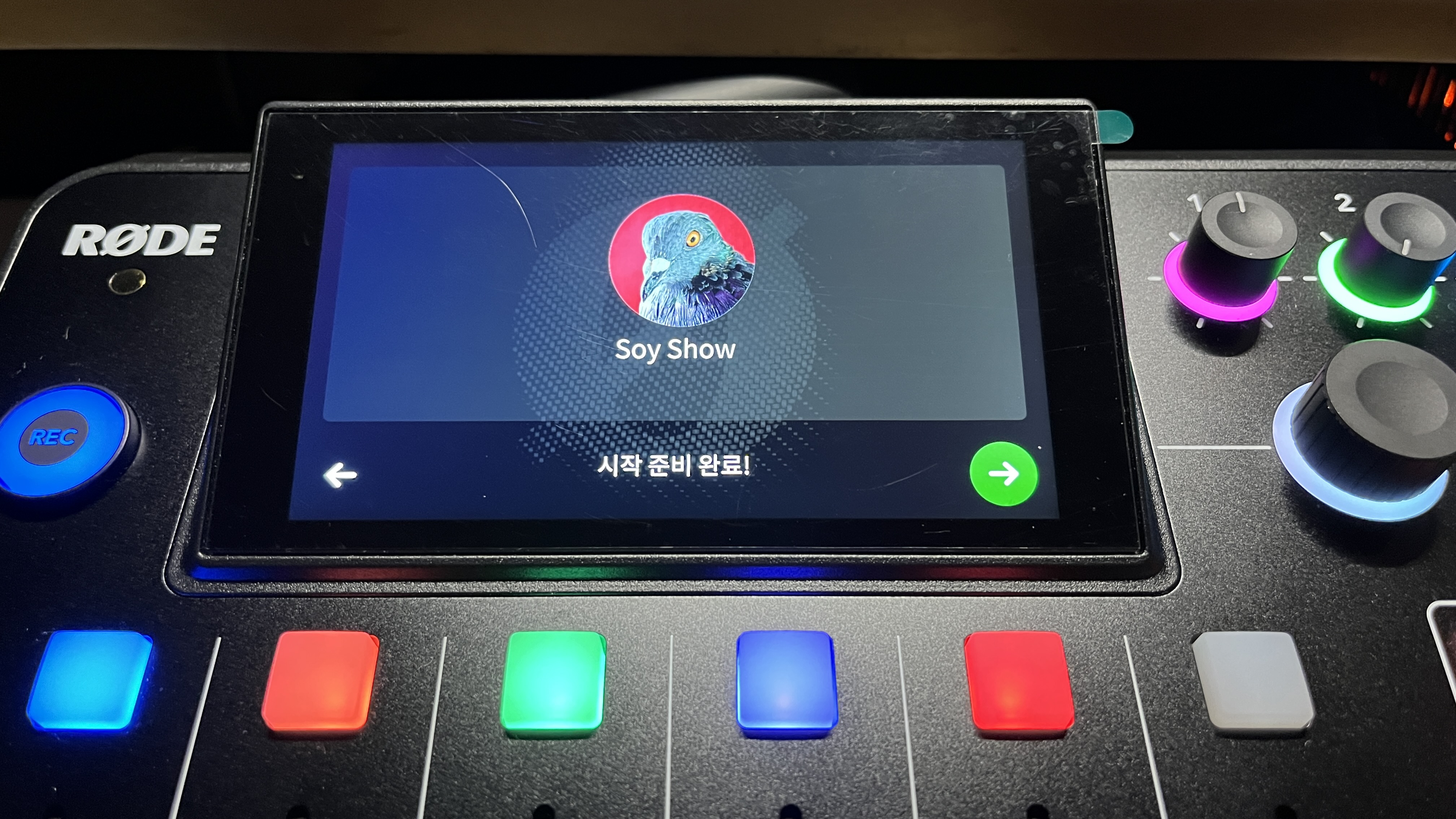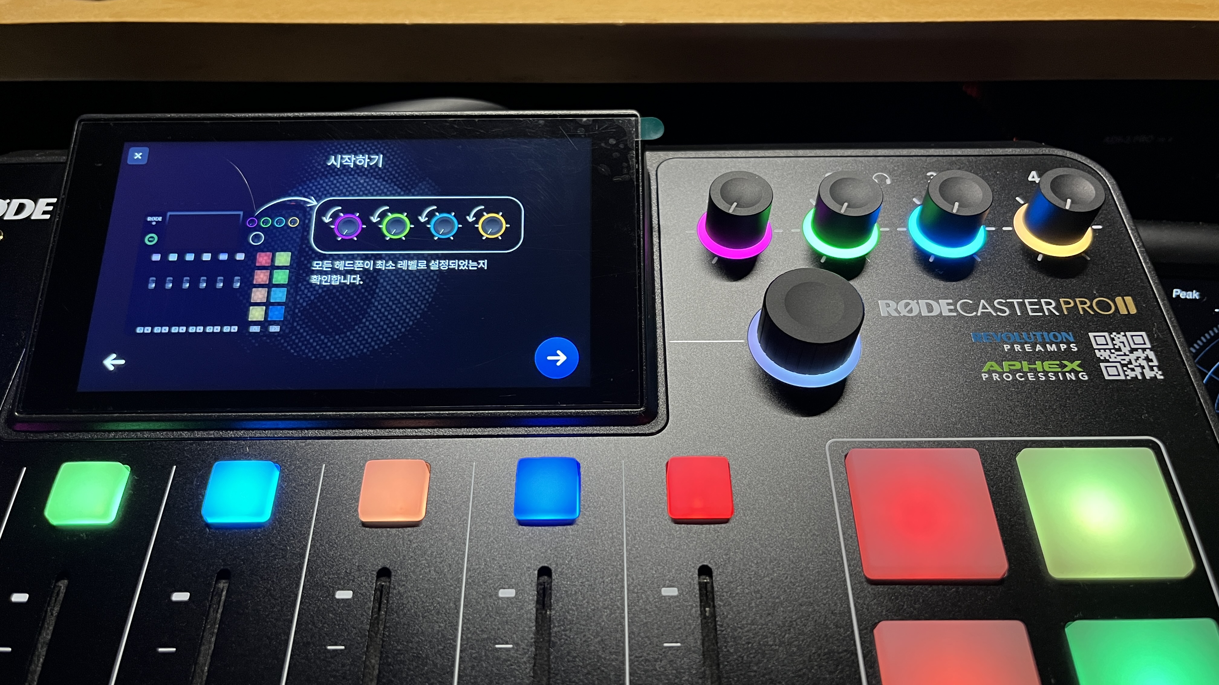뒷면의 전원 버튼을 가볍게 누르면 약간의 로딩 후 "RøDECaster Duo"라는 글자가 나오며 초기 세팅이 시작된다. 이미 디지털 믹서를 많이 만져본 사람도 있겠지만, 처음 RøDECaster Duo로 디지털 믹서를 접하는 사람들도 있기에 이러한 세팅 과정은 중요하다고 생각한다.
