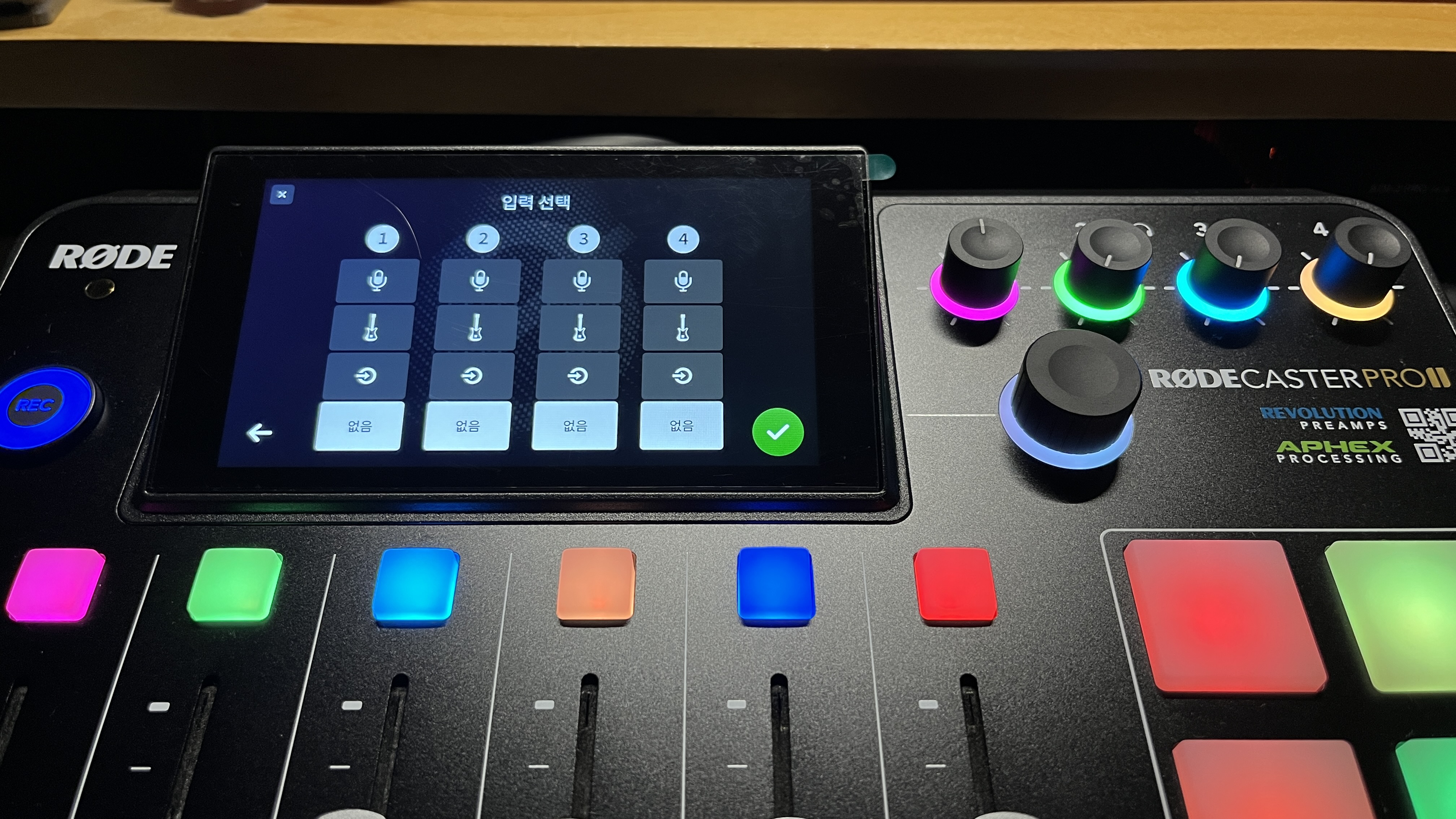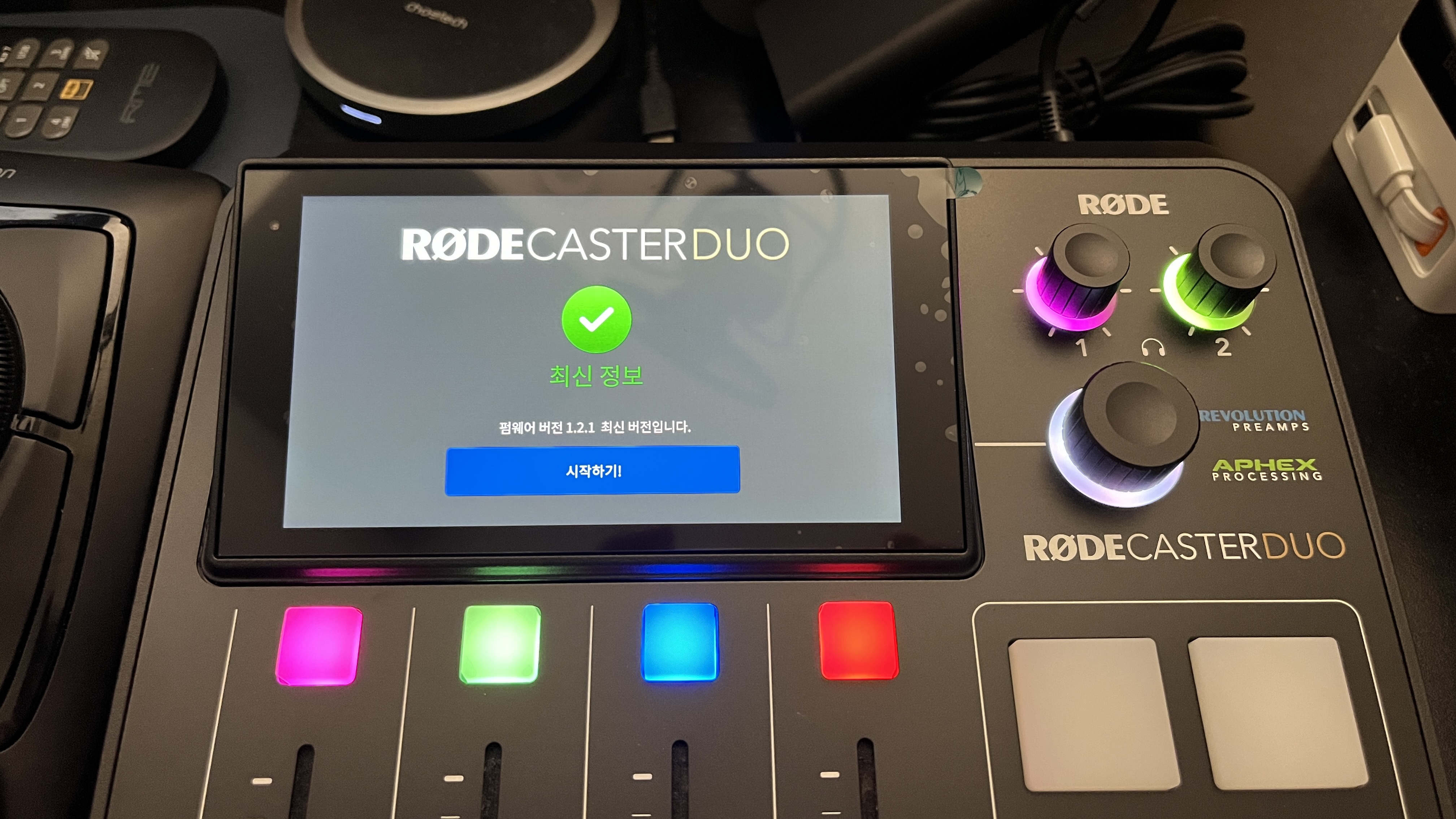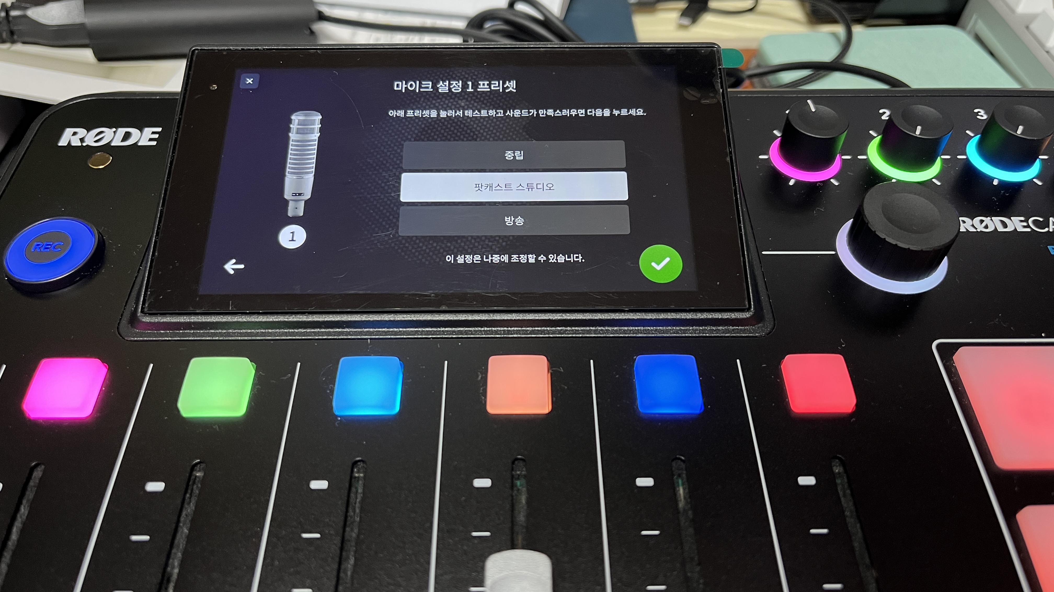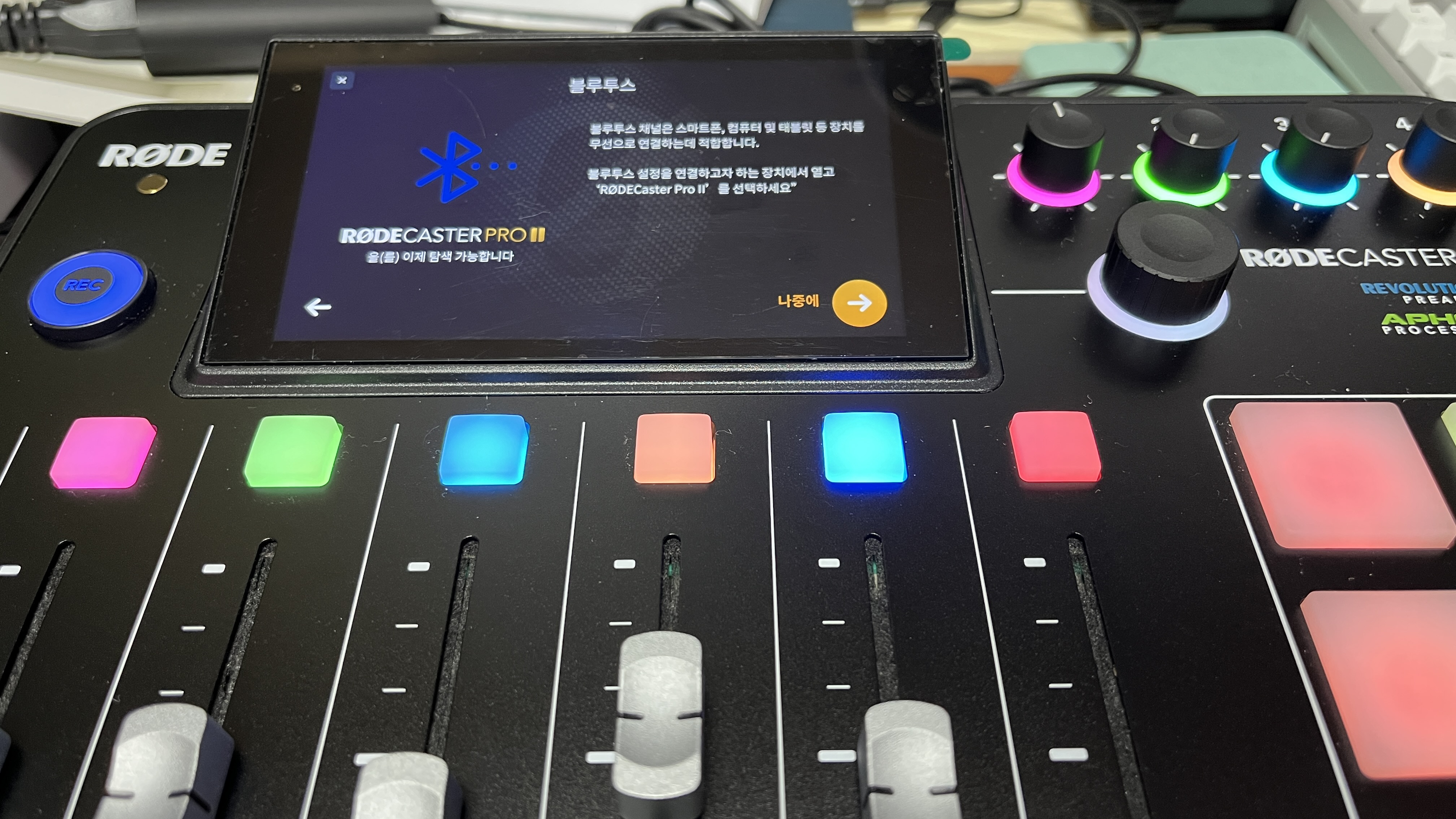 뒷면의 전원 버튼을 가볍게 누르면 약간의 로딩 후 "RøDECaster Duo"라는 글자가 나오며 초기 세팅이 시작된다. 이미 디지털 믹서를 많이 만져본 사람도 있겠지만, 처음 RøDECaster Duo로 디지털 믹서를 접하는 사람들도 있기에 이러한 세팅 과정은 중요하다고 생각한다.