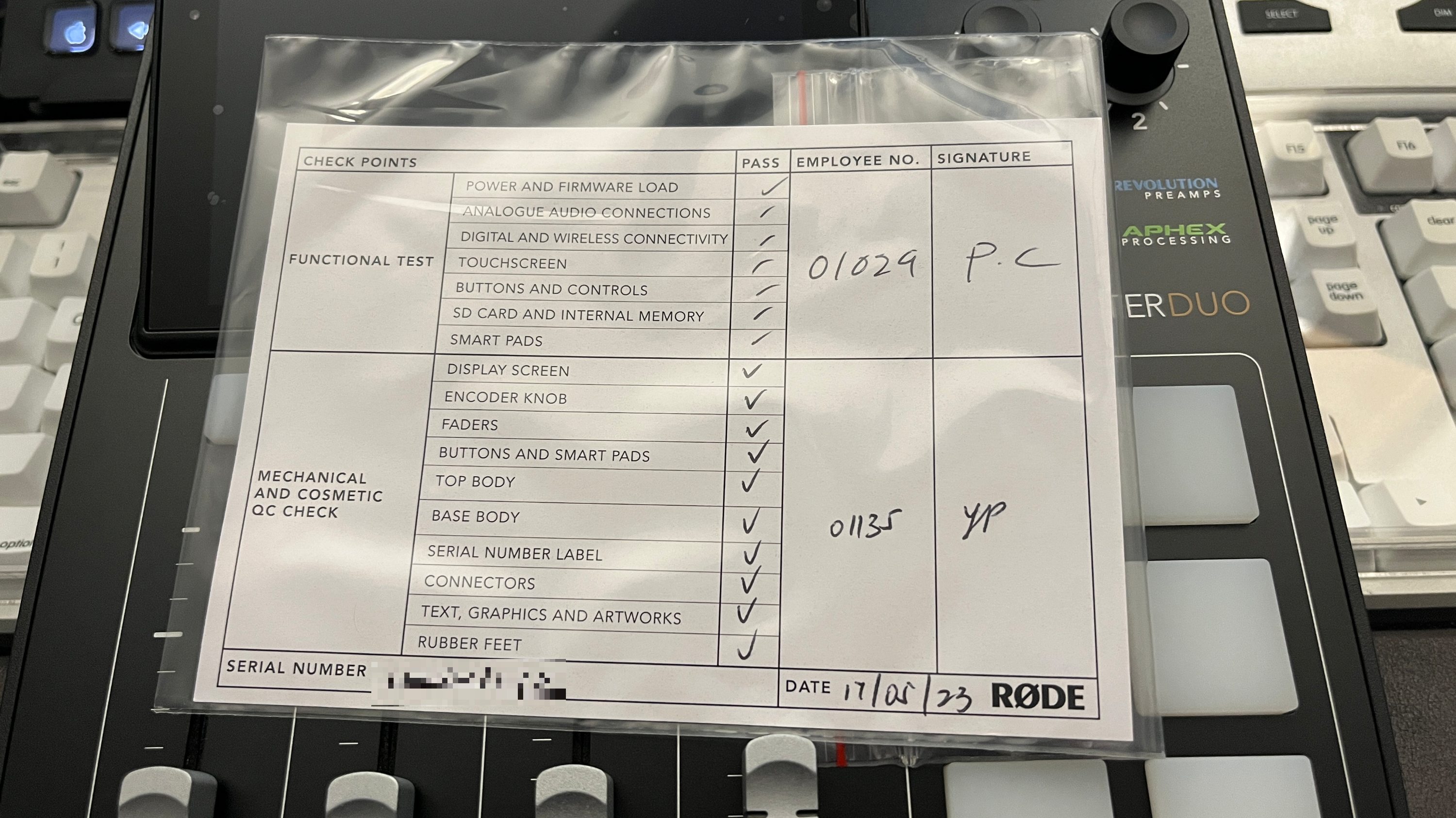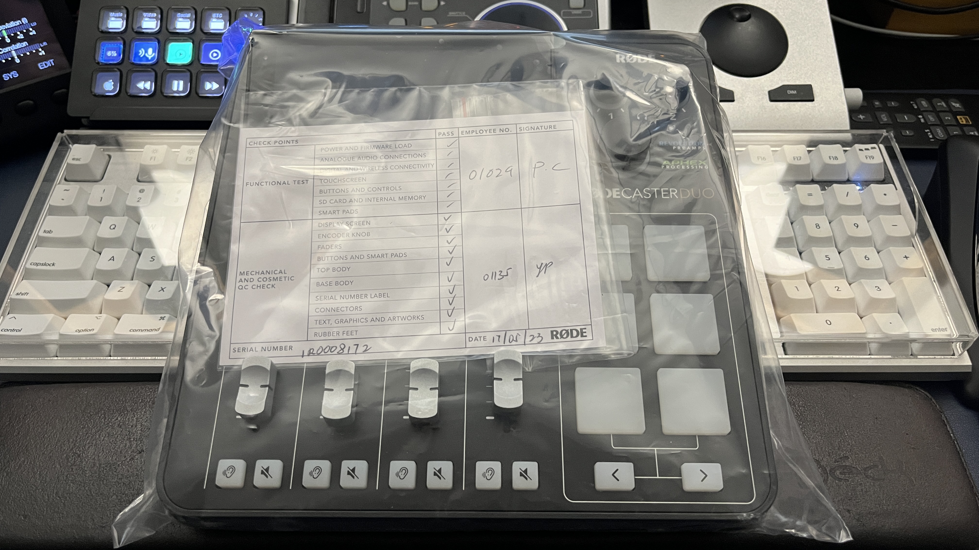 RøDECaster Pro II를 개봉할 때에는 못 본 거 같은데 RøDECaster Duo에는 기능 테스트 검수 시트가 같이 동봉되어 있었다. 전원부터 제품 코스메틱 이슈까지 체크한 후 사원 번호와 사인, 그리고 검수 날짜가 적혀 있는 검수 시트를 보니 훨씬 신뢰성이 높아졌다. 다른 회사들도 이런 검수 시트들이 들어가 있다면 제품을 받을 때 훨씬 신뢰성이 올라가지 않을까.