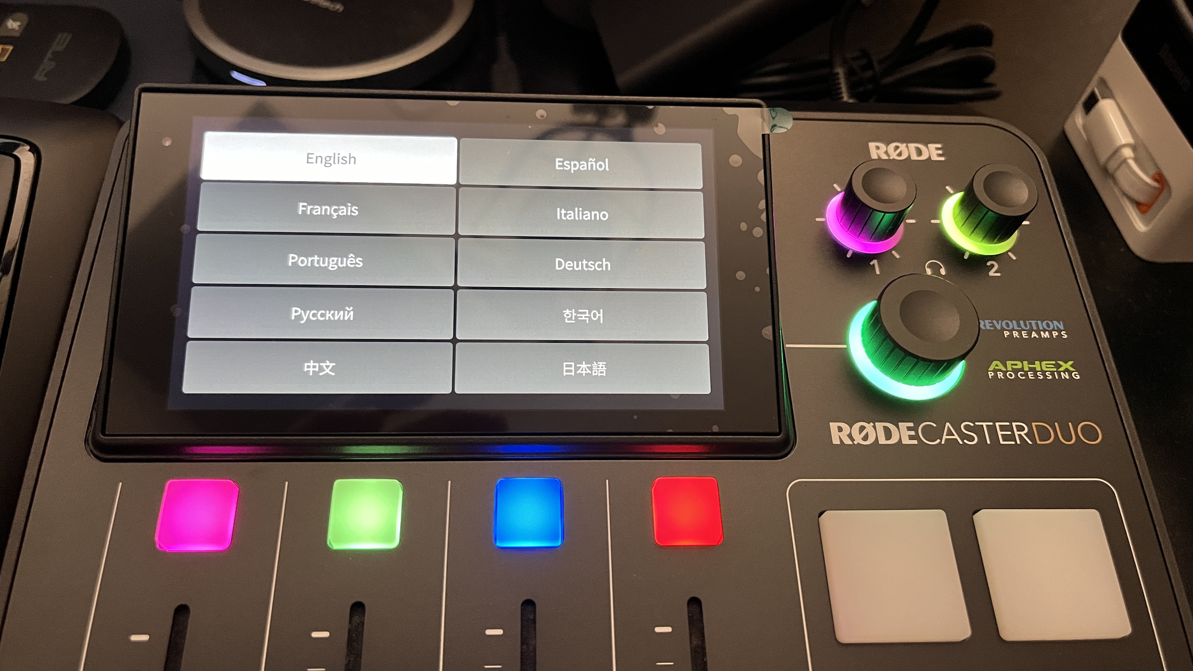 천릿길로 한 걸음부터라고, 설정의 시작은 언어 설정부터다. RøDECaster Duo는 총 10개의 언어를 지원하는데, 한국어를 지원하는 게 눈에 띈다. 여기서 필자는 한국어로 설정 후 다음 과정을 진행하였다. 한국어로 설정했을 때 용어들이 어떻게 번역되었을지 궁금했기 때문이다. 다만 필자의 개인적인 의견이지만 어느 정도 음향 관련 지식이 있는 사람이라면 "영어"로 언어 설정을 하는 걸 권한다. 번역 문제도 있고, 인터넷에 훨씬 많은 정보들이 영어로 진행되는터라 문제 발생 시 더욱 빠르게 해결되는 등 은근히 도움이 된다. 포토샵이 한국어를 지원하는데 대다수의 강의들이 영어 기반으로 진행되는 것과 같은 사례라고 이해하면 좋을 듯하다.