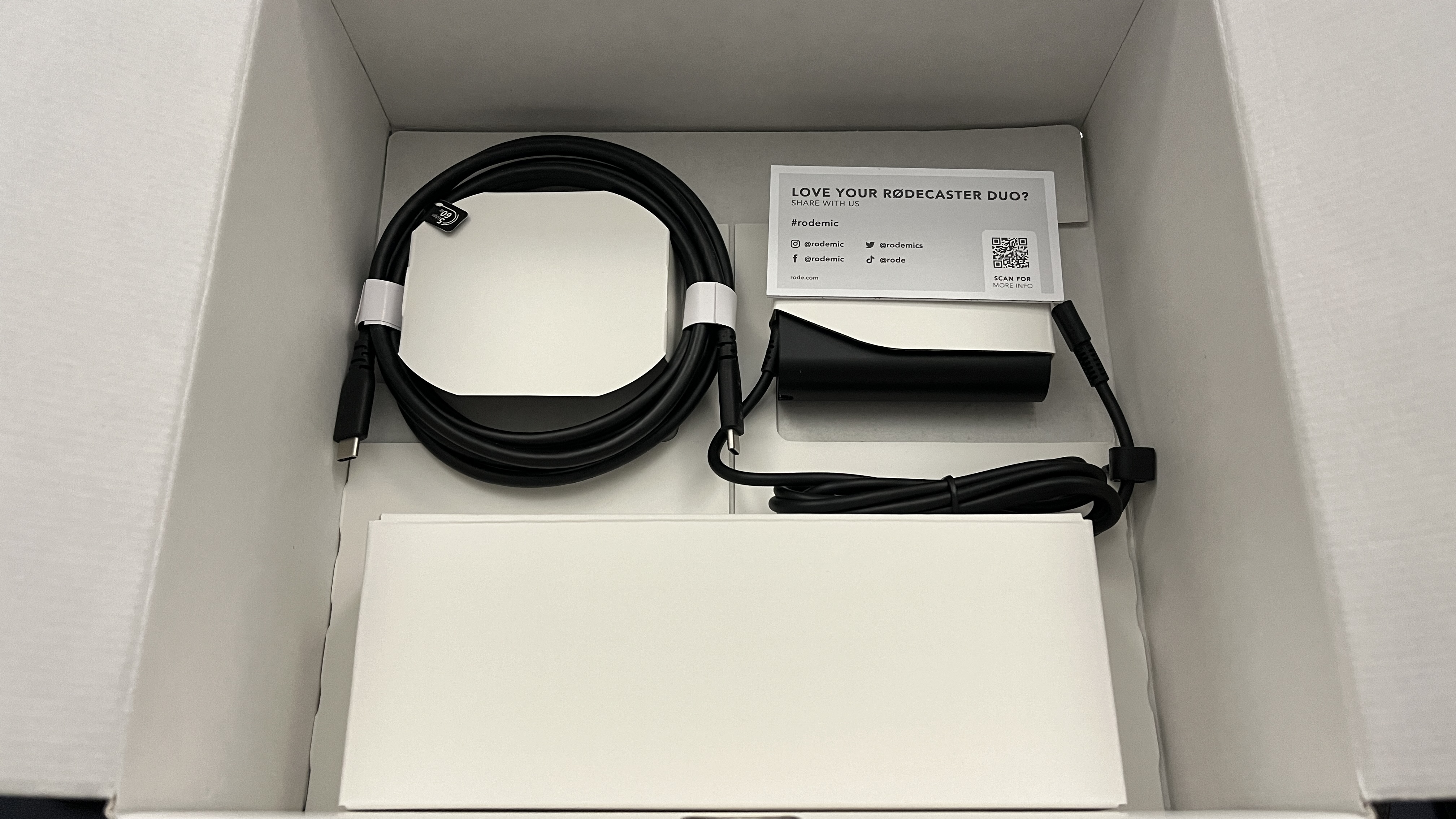 구성품은 박스 사이즈에 비해 굉장히 작다. 심지어 별도의 매뉴얼도 없는 게 조금 도전적이다는 인상이다. 다만 전원 어댑터가 USB-C 타입으로 되어 있어 공식 어댑터가 없더라도 27W를 지원하는 충전기가 있다면 언제든 RøDECaster Duo를 작동할 수 있다. 조금 충전기를 가리는 경향이 있기 때문에 되도록 정품 충전기를 사용하는 게 좋다. 또한 디지털 믹서답게 전체적인 케이블들의 길이가 긴 편이다. 케이블 정리는 필수적일 듯하다.