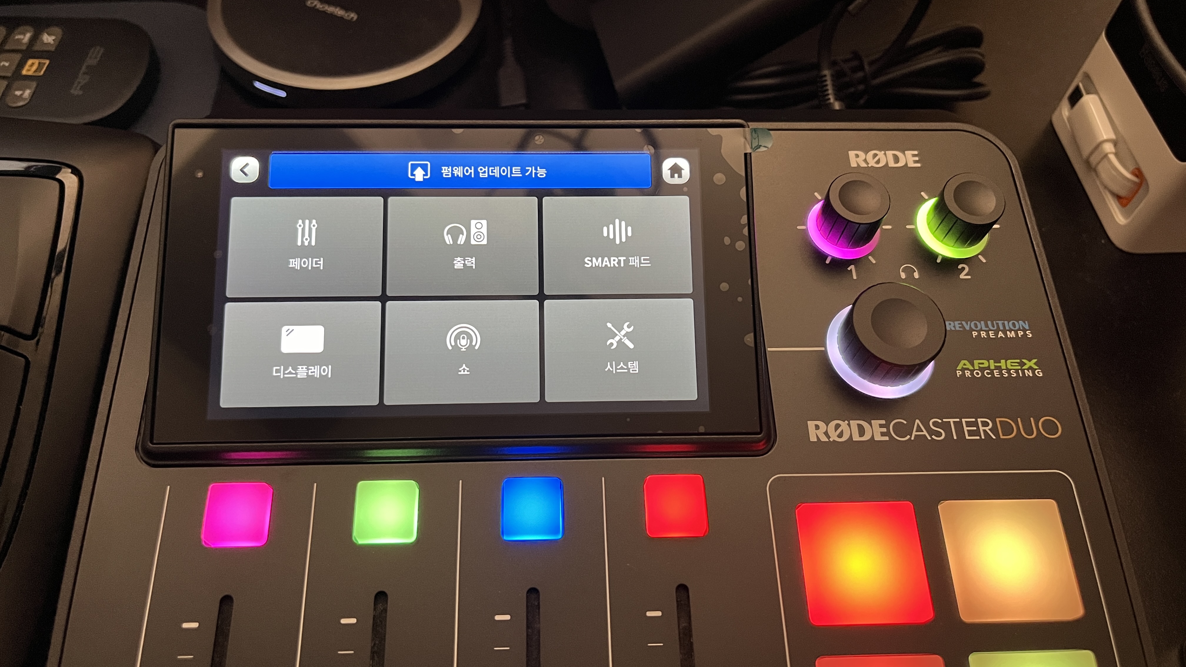 RøDECaster Duo를 박스에서 따로 꺼내 보았다. 4개의 페이더와 거대한 디스플레이, 우측 상단의 노브들, 우측의 패드가 가장 먼저 눈에 들어온다. 상단의 디스플레이는 터치를 지원한다. 크기는 스마트폰 디스플레이보다 살짝 큰 편이라 시인성이 좋다. 디스플레이 하단에는 6개의 페이더와 채널 선택 버튼이 있다. 페이더들은 모터 페이더는 아니지만 꽤 좋은 품질이다. 상하로 움직일 때 적당히 묵직하면서도 고정력이 좋다. 우측의 패드는 물리적으로 눌리는 방식이 아닌 고급형 모델에서 볼 수 있는 딱딱한 방식이다. 오래 두드린다면 손가락에 피로는 쌓이겠지만 내구성 하나는 좋다. 페이더들 하단에는 솔로 및 채널 뮤트 버튼들이 있다. 솔로 및 뮤트 버튼은 DAW들을 많이 사용해 본 사람이라면 익숙한 개념이다. 그것들과 동일한 기능이다.