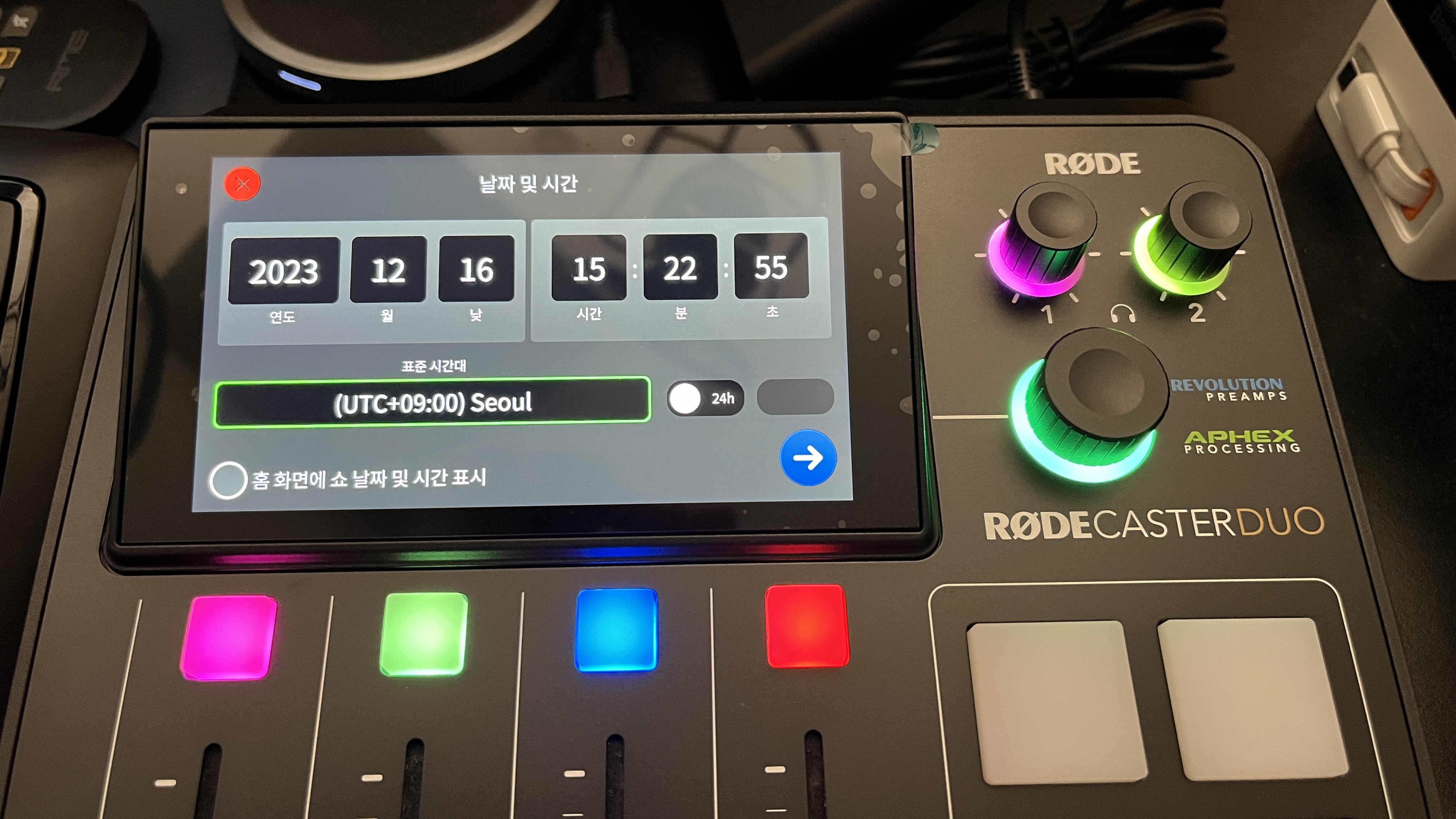 언어 설정이 끝났다면 이제 시간 설정을 할 차례다. 시간 설정을 꼭 해야 하나?라는 의구심이 들 수도 있지만, 팟캐스트 레코딩이나 라이브 방송 시 시간이 매우 중요한 요소임을 생각한다면 되도록 정확한 시간으로 맞춰주는 것이 좋다. 기본적으로 터치로 조작하며, 24시간 옵션 및 AM/PM 설정, 표준 시간대 설정 등을 추가로 할 수 있다. 아래에 있는 "홈 화면에 쇼 날짜 및 시간 표시"는 이후 설정이 끝나면 시간을 홈 화면에 보일 건지의 여부를 결정하는 기능이다. 추후 끌 수도 있으니 일단은 켜고 다음으로 진행하겠다.
