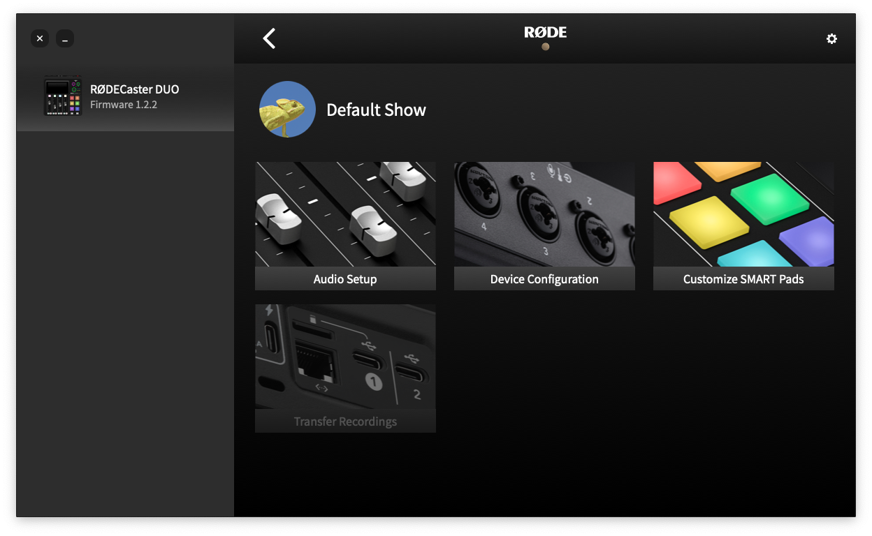 우측에 연결된 제품을 누르면 지금 만들어진 Show의 이름과 함께 조작할 수 있는 기능들의 리스트가 나온다. RøDECaster DUO 내부에서도 조절할 수 있는 기능들이 보인다. 이것을 터치가 아닌 컴퓨터에서 조작할 수 있다는 점에서 매우 편리하다. 마지막의 Transfer Recordings 기능의 경우는 MicroSD를 RøDECaster DUO에 삽입했을 경우에만 활성화된다.