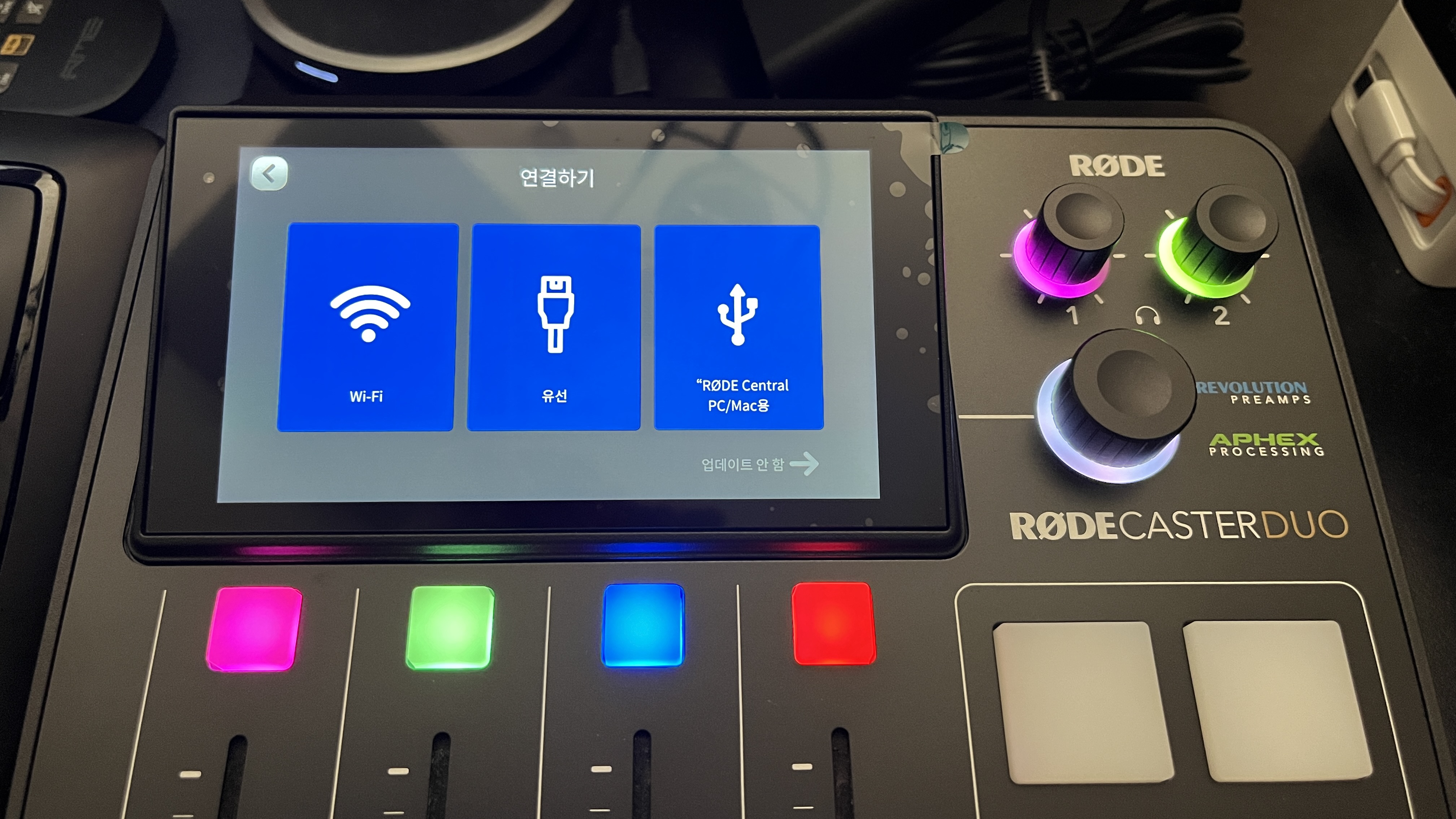 날짜 및 시간 설정이 끝났다면 인터넷 접속 여부를 묻는다. RøDECaster Duo는 오디오 인터페이스이면서 디지털 믹서인지라 Wi-Fi나 랜 포트를 통해 자동 펌웨어 업데이트 등을 지원한다. 또한 컴퓨터에 연결해서 전용 프로그램 "RøDE Central"을 통해 펌웨어 업데이트를 할 수 있다. 이번엔 인터넷에 연결해 보기로 했다. Wi-Fi를 선택한 후 평소에 하던 것처럼 인터넷 연결을 진행했다.
