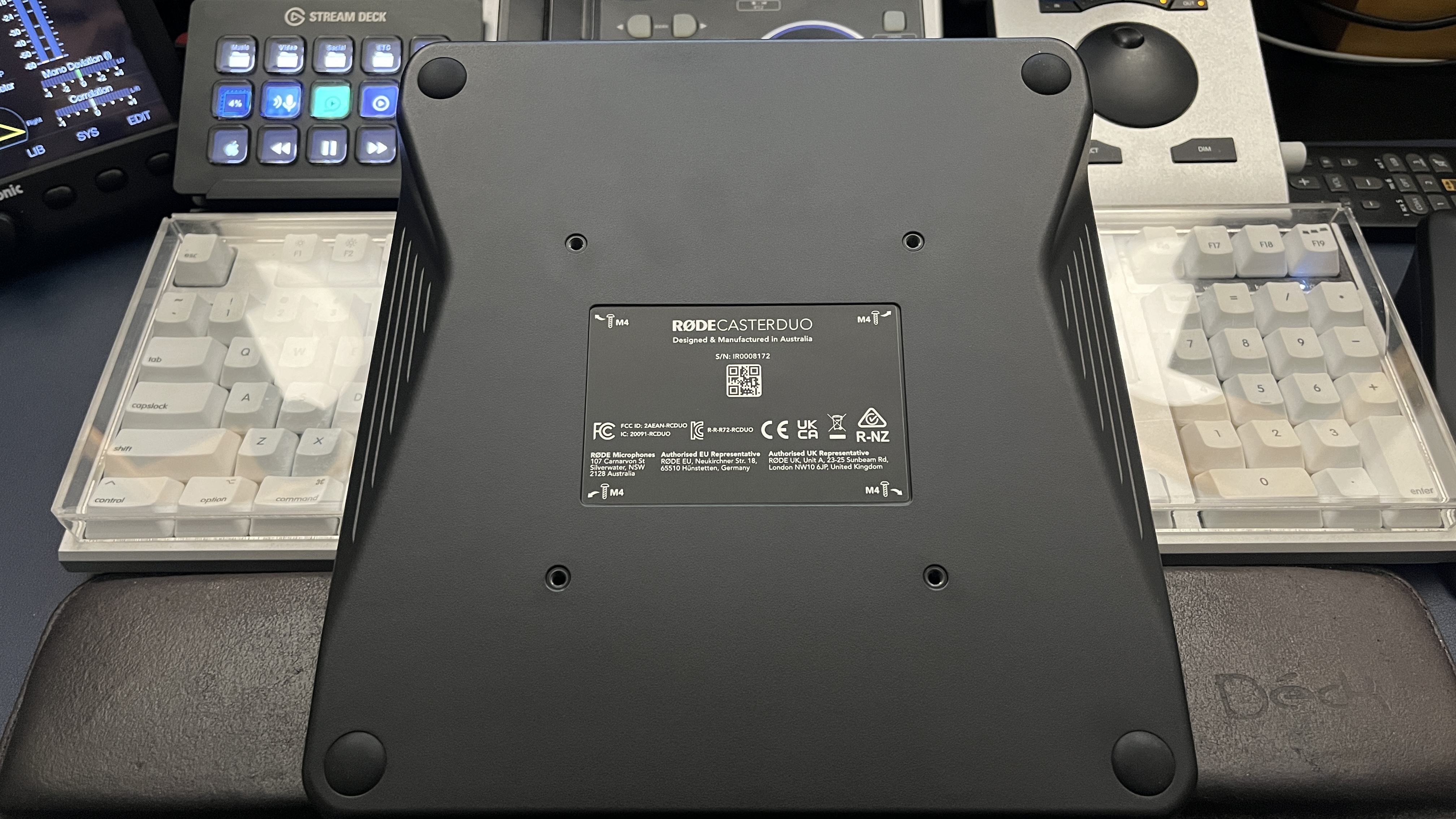 바닥에는 VESA 마운트 구멍이 위치해 있다. RøDECaster Pro II에 있던 스탠드 홀은 삭제되었다. 사람들이 자주 안 썼나 보다. 책상 위에 올려놓을 수 있게끔 고무발도 충실하게 달려 있다. 바퀴가 달린 Vesa 호환 스탠드에 RøDECaster Duo를 연결한다면 더욱 다양한 장소에서 활용할 수 있어 보인다.