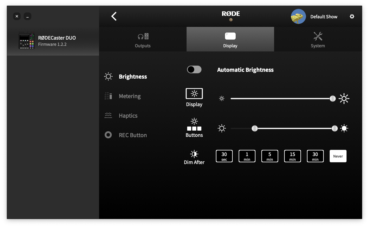 장비 설정 화면에서는 RøDECaster Duo의 내부 설정들을 조작할 수 있다. 위에서 살펴봤던 헤드폰 출력, 모니터, 라우팅, 리슨, 멀티트랙, 마스터 프로세싱뿐만 아니라 화면 설정 및 시스템 설정을 마우스로 조작할 수 있다.
