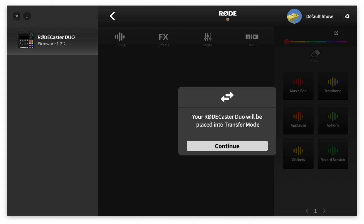 위에서 RøDECaster Duo 내부 설정으로는 스마트 패드에 새로운 샘플들을 추가할 수 없다고 언급한 바 있다. 하지만 RøDE Central을 이용한다면 스마트 패드에 새로운 오디오 샘플들을 넣을 수 있다. 그전에 RøDECaster Duo를 전송 모드로 전환할 필요가 있다. 화면의 Continue 버튼을 누르면 자동으로 RøDECaster Duo가 전송 모드로 들어간다.