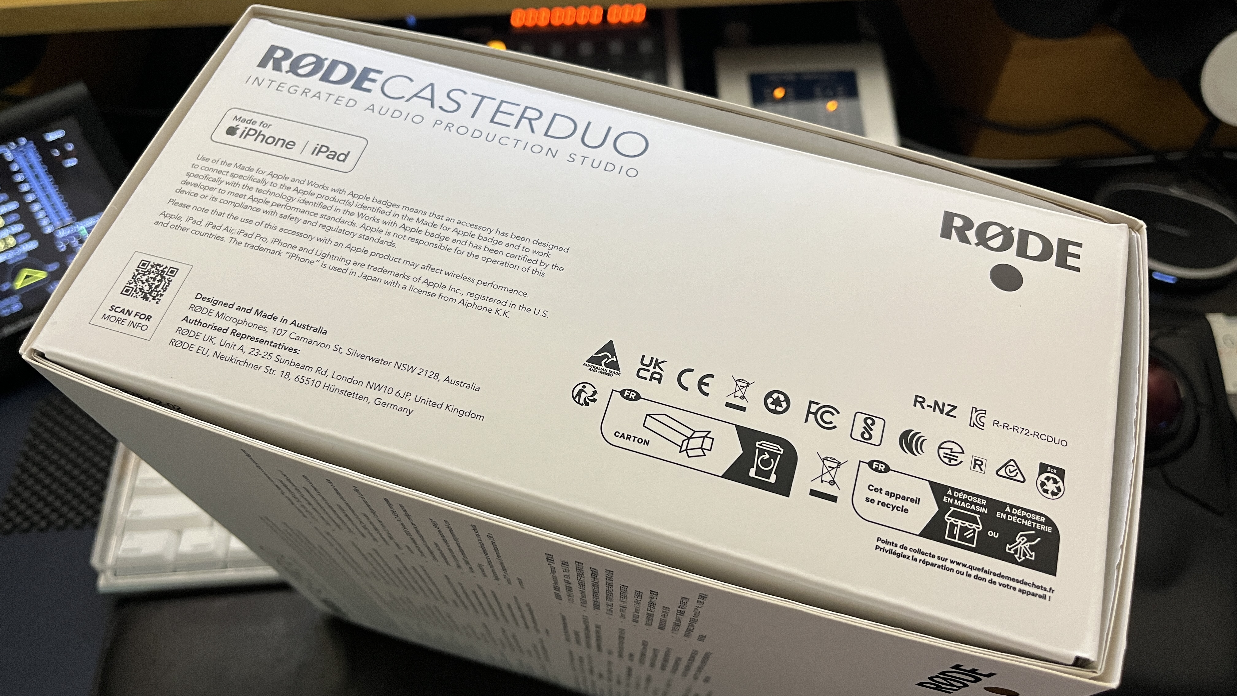 바로 반대쪽에도 거의 동일한 정보가 담겨 있지만, 각 국가별로 제품 인증을 받은 로고와 보다 많은 정보를 확인할 수 있는 QR코드가 인쇄되어 있다. 눈에 띄는 점으로는 RøDECaster Duo가 저번과 마찬가지로 MFI 인증을 받아 아이패드나 아이폰의 주변기기로서 원활하게 작동된다고 한다. 또 하나 눈에 띄는 점으로는 재활용 방법에 대한 설명이 같이 되어 있다는 점이다. 친환경 열풍이 음악 기기에서도 불고 있다.