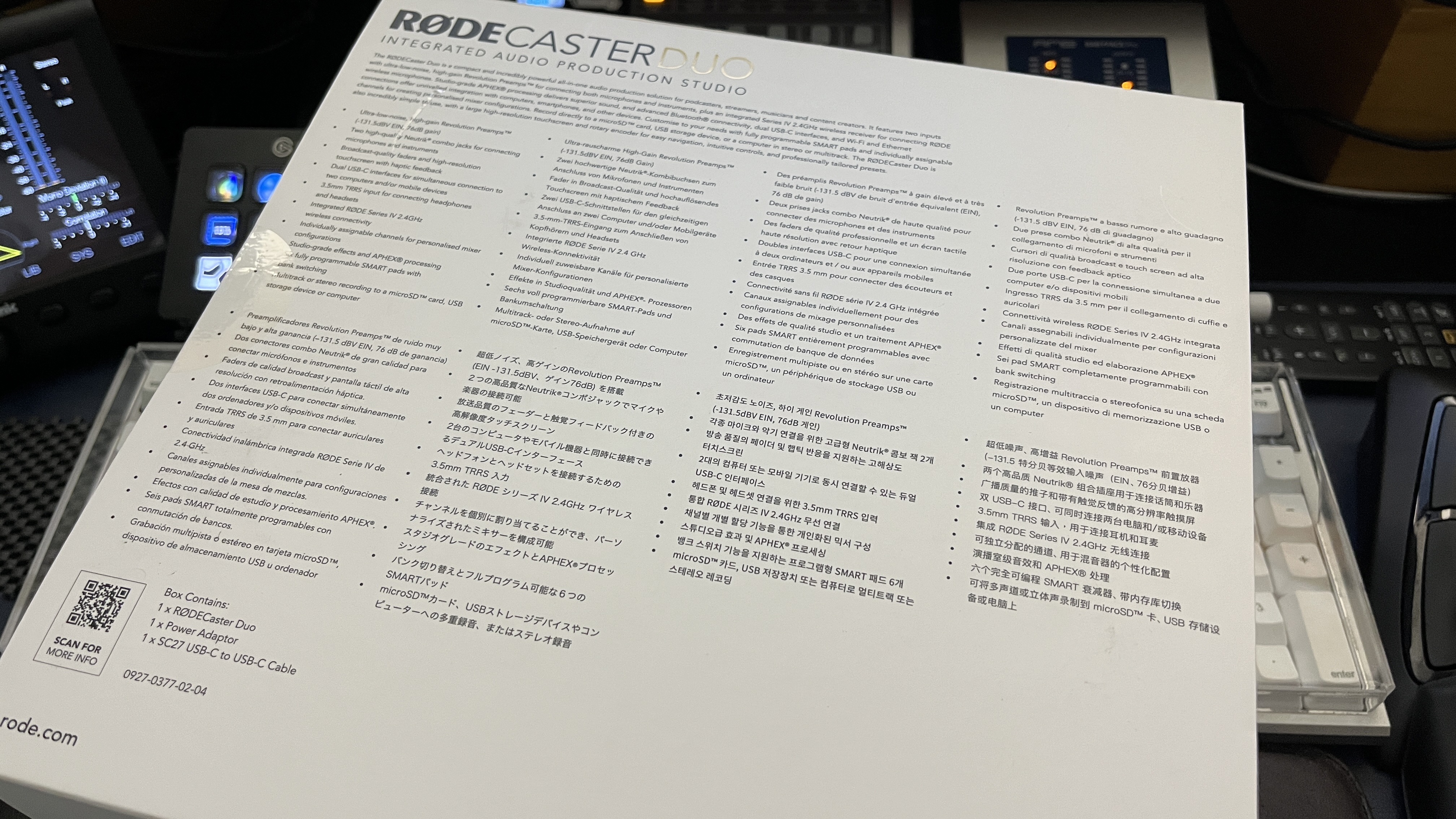 후면에는 RøDECaster Duo에 대한 상세한 설명과 구성 요소들이 영어로 빼곡하게 인쇄되어 있다. 그 옆으로는 8개 국어로 제품의 특징들을 인쇄했는데, 이번에도 한국어가 마지막에 포함되어 있다! 번역 품질은 좋은 편은 아니긴 한데, 이전보다는 꽤 나아졌다. 앞으로도 더욱 개선해줬으면 한다.