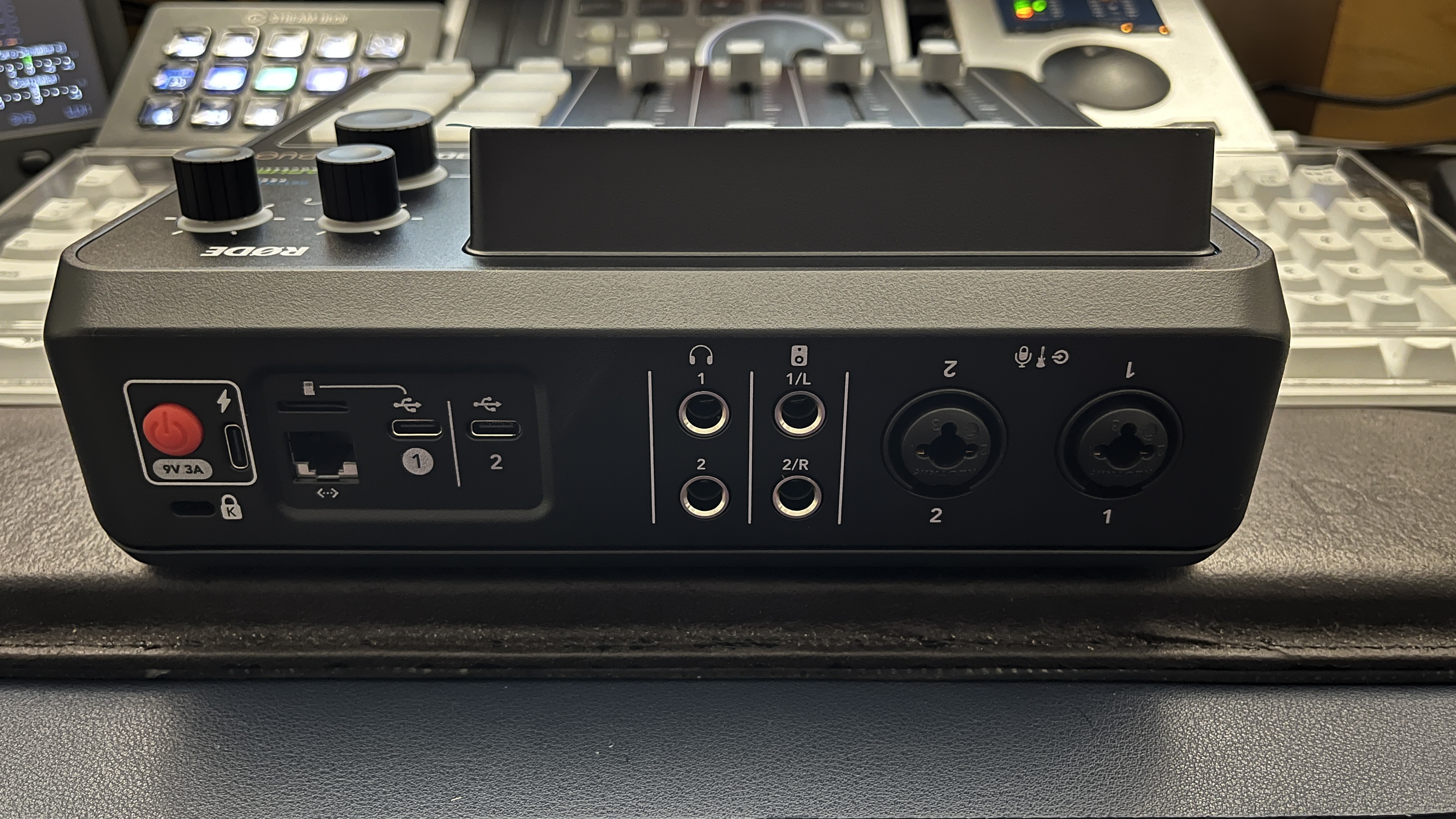 가운데에는 2개의 6.3mm 헤드폰 출력 포트와 2개의 6.3mm 스피커 출력 포트, 그리고 2개의 콤보 잭 입력 포트가 있다. RøDECaster Pro II 대비 포트 개수가 절반으로 줄었다. 기능은 유지한 채 입출력을 줄여 가볍게 사용할 목적에 부합하다. 콤보 잭 포트를 보면 숫자가 뒤집혀 있어 위에서 봤을 때도 포트 번호를 읽을 수 있게끔 배려하였다. 헤드폰 포트 및 콤보잭 포트들이 전부 후면에 있어 조금 귀찮을 수도 있지만, 디지털 믹서의 특성상 한번 세팅하면 해체하기 전까지는 세팅을 바꿀 일이 웬만해선 없기 때문에 상관없는 부분이 아닐까 싶다. 애초에 RøDECaster Duo를 쓰는 환경 자체가 보다 전문적인 팟캐스트 전문 스튜디오에서 사용한다는 걸 상정하고 개발했기에 의도적으로 모든 포트들을 뒤에 배치한 게 아닐까 싶다.