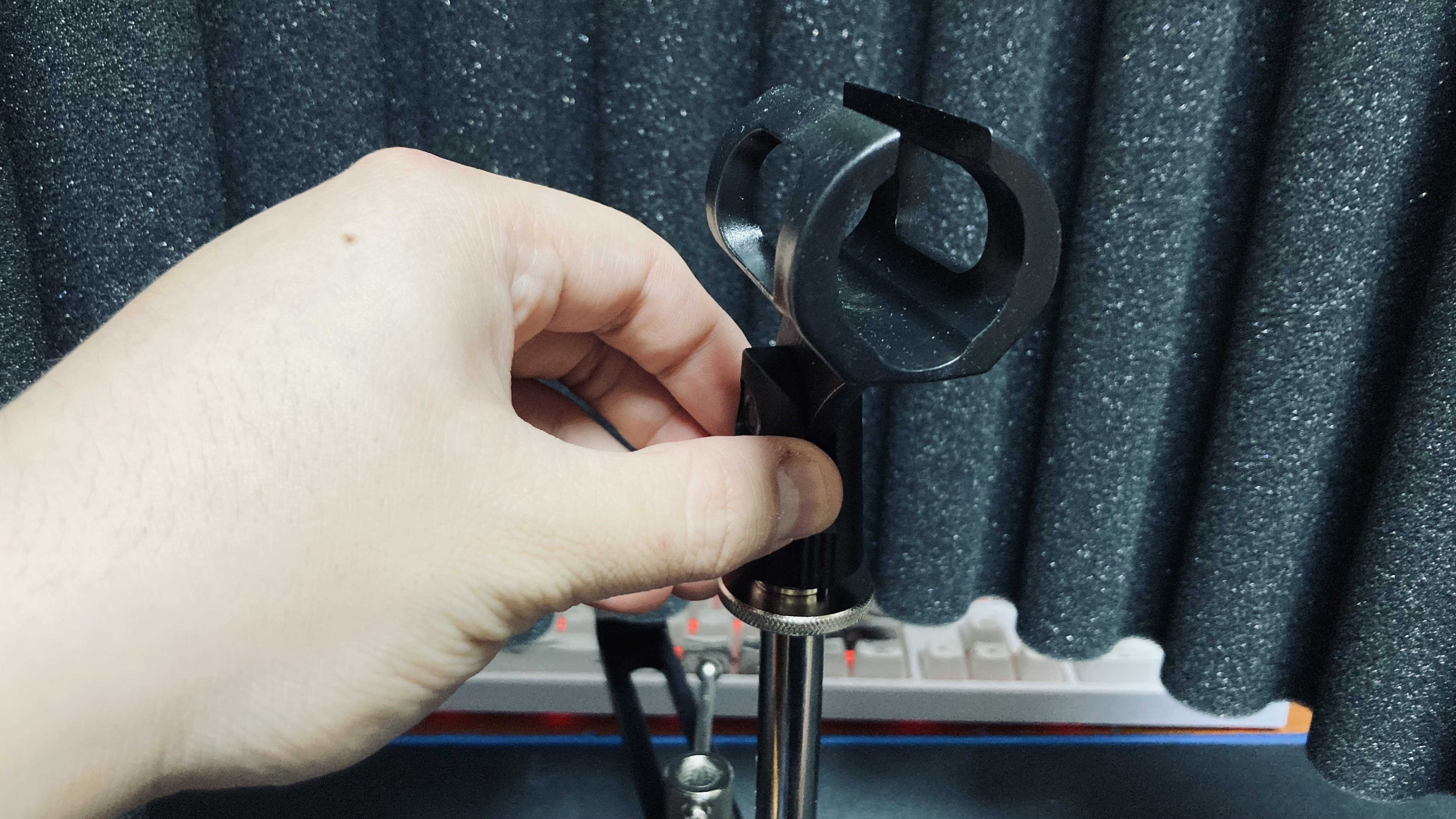 마지막 단계다. 마이크가 고정될 마이크 홀더를 가장 높게 튀어나와 있는 설치 브라킷에 돌려서 설치한다. 쇽 마운트를 사용해도 되고 일반적인 마이크 홀더를 사용해도 무방하다. 단 쇽 마운트를 사용할 경우에는 마이크 수음 부분에 맞춰서 쇽 마운트를 조절하자. 마이크 홀더를 설치한 후 마이크 배치 및 선정리 작업을 하면 설치는 끝난다.
