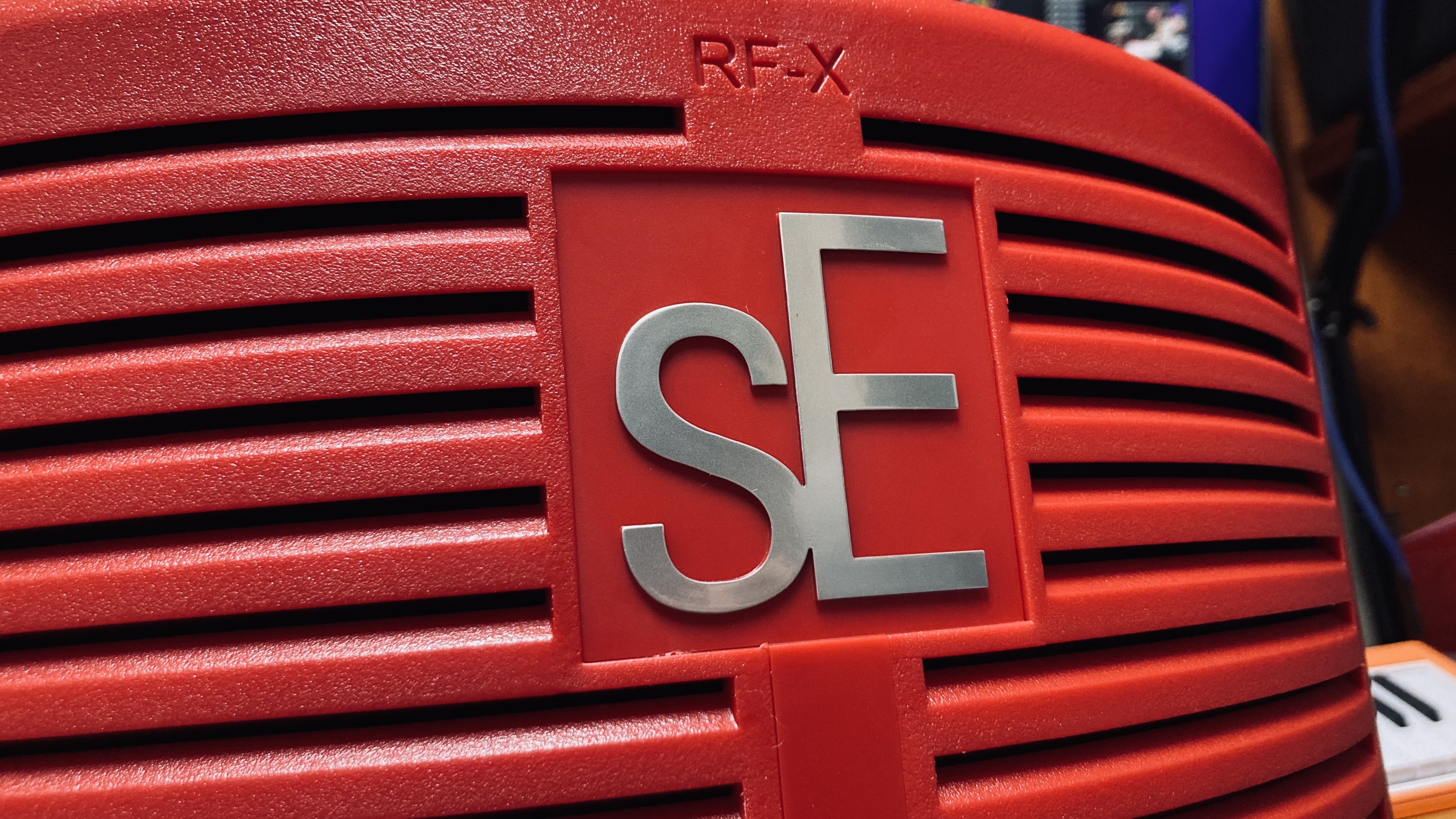 RF-X 뒷부분은 거대한 플라스틱 프레임으로 이루어져 있다. 프레임 상단에는 "RF-X" 글자가 음각으로 새겨져 있고, 그 아래에 거대하게 "sE" 글자가 금속 빛으로 빛나고 있다. 그리고 빼곡하게 홈이 파여 있다. 플라스틱 프레임으로 되어 있어 가볍다고 생각할 수도 있겠지만 생각보다 무게가 나간다. RF-X는 5.2파운드, 킬로그램으로는 2.4킬로그램 정도다. 웬만한 아령 정도의 무게다. 그렇기에 일반적인 가정집이나 방송용으로 사용되는, 기껏해야 1.1킬로 이상의 무게만 커버할 수 있는 굴절식 마이크 스탠드에는 절대 달 수가 없다. 일반적인 마이크 스탠드에 달아 사용하라고 나온 장비다. 이 제품이 "포터블"을 지향한 장비라고 제조사에서는 설명하고 있는데, 무게에서나 부피에서나 절대 포터블 하지는 않다. 접을 수 있게 설계가 되었다면 무게는 차차하고 들고 다닐 수 있을 만한 정도였을텐데... 아쉬운 부분이다.