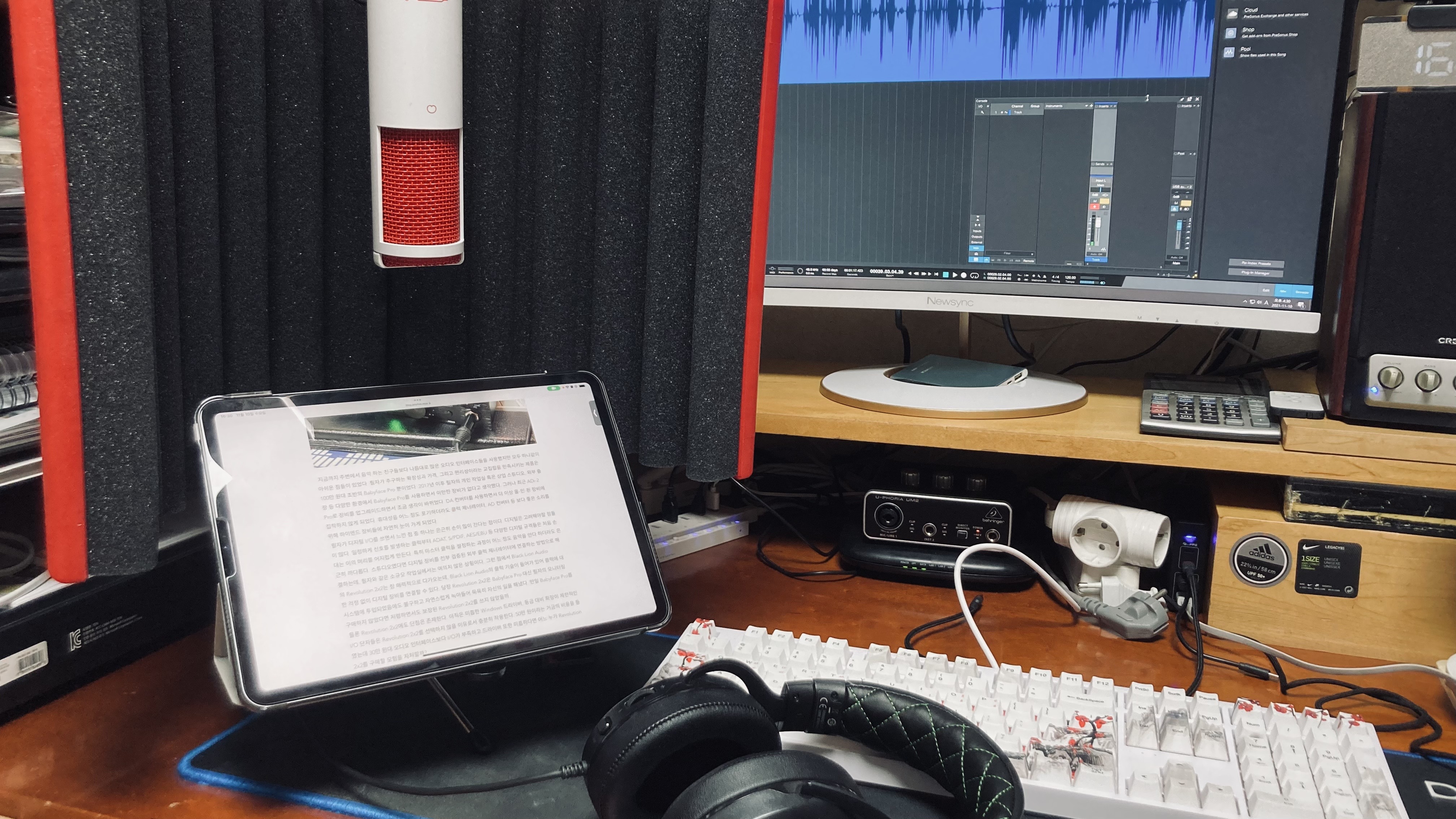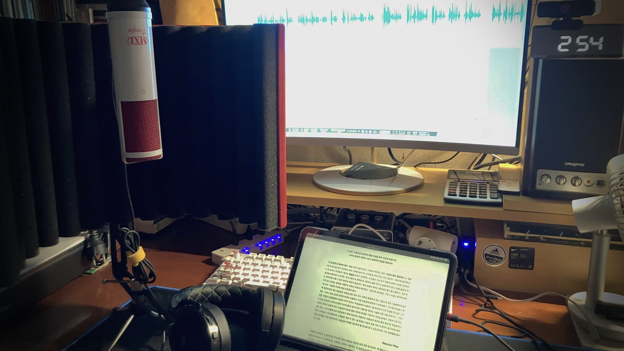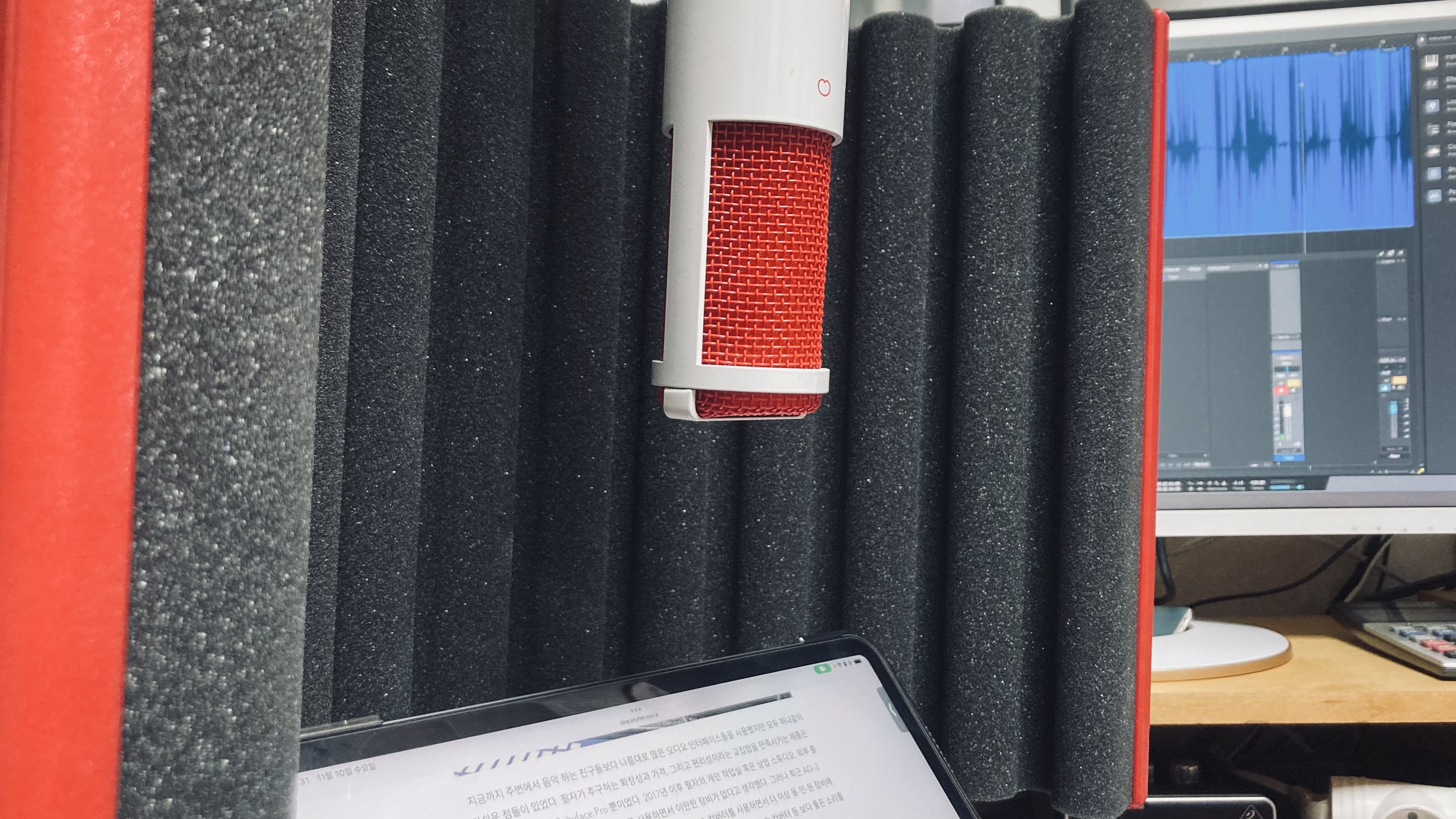 필자는 주로 주로 음악 믹싱 및 마스터링을 작업하지만 최근 들어서는 친구들과 간단하게 팟캐스트 녹음을 진행하고 있다. 음악 레코딩보다는 상대적으로 자유롭지만, 그럼에도 주변의 불필요한 잡음 및 필요 이상의 주변 반사음들이 들어오면 나중에 편집 시에 곤란한 상황에 놓이는지라, 레코딩의 중요성을 계속 인지하고 있다. 필자의 레코딩 샘플은 팟캐스트 대본을 읽는 방향으로 진행할 듯하다.