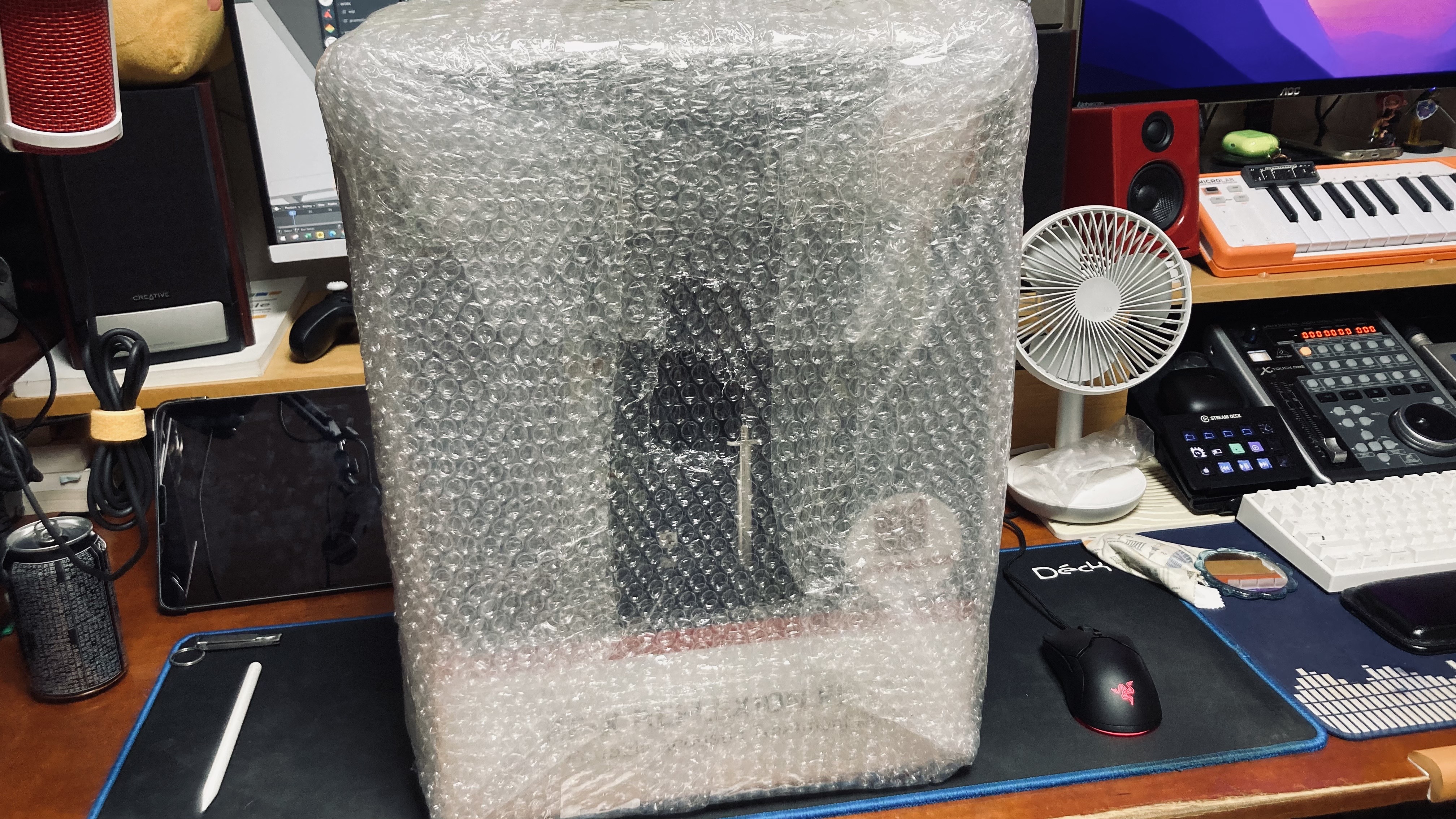여러 겹의 완충재로 감싸진 오늘의 주인공이 필자의 작업실 앞에 도착했다. 매우 튼튼하게 감싸져 있는 뽁뽁이들과 박스의 크기에 그만 필자는 압도당하고 말았다. 별도의 박스에 담겨 온 게 아니라 진짜로 저렇게 왔다. 아무래도 부피가 크다 보니 배송 과정에서 던질 위험은 없어 보인다.