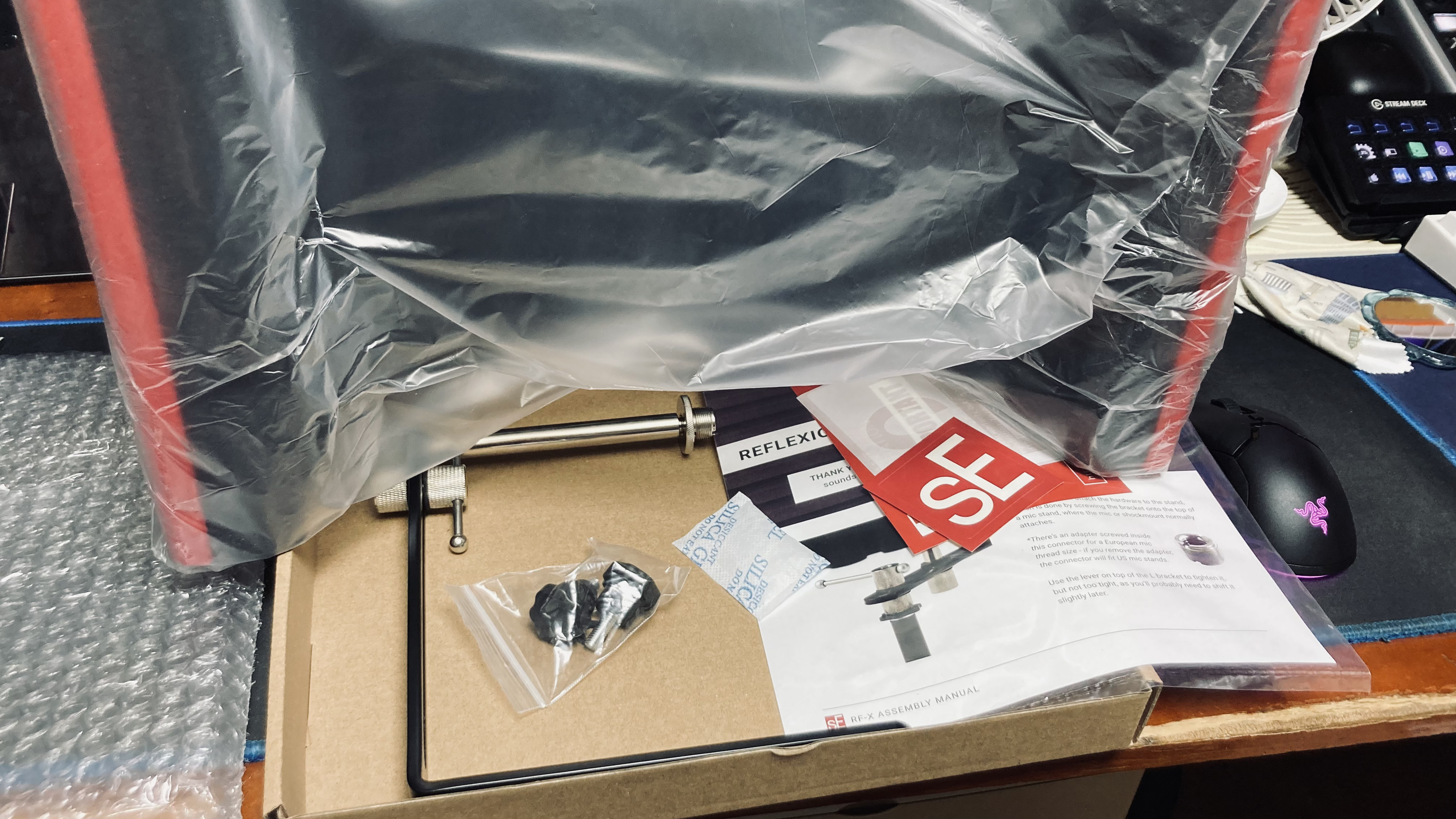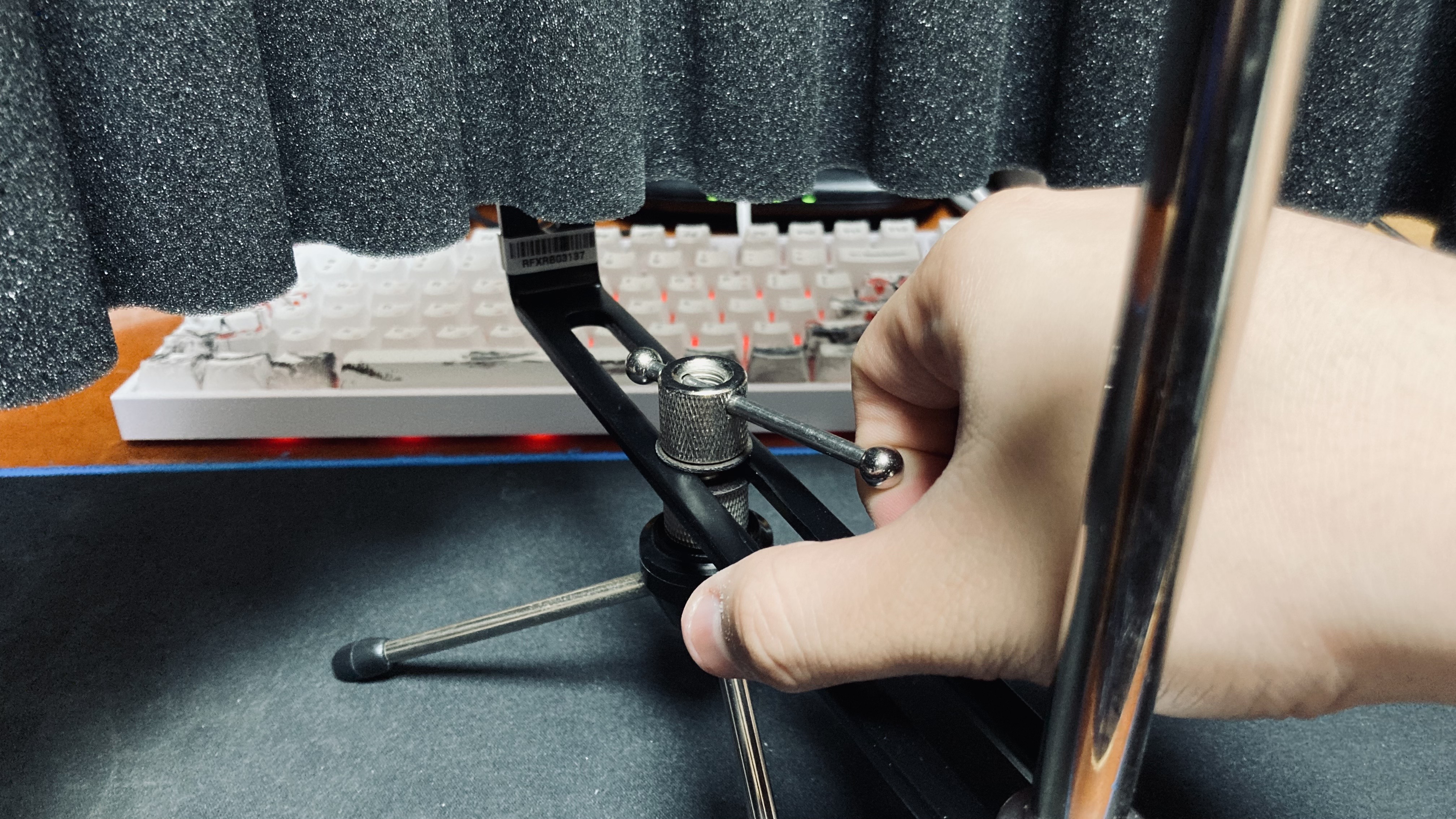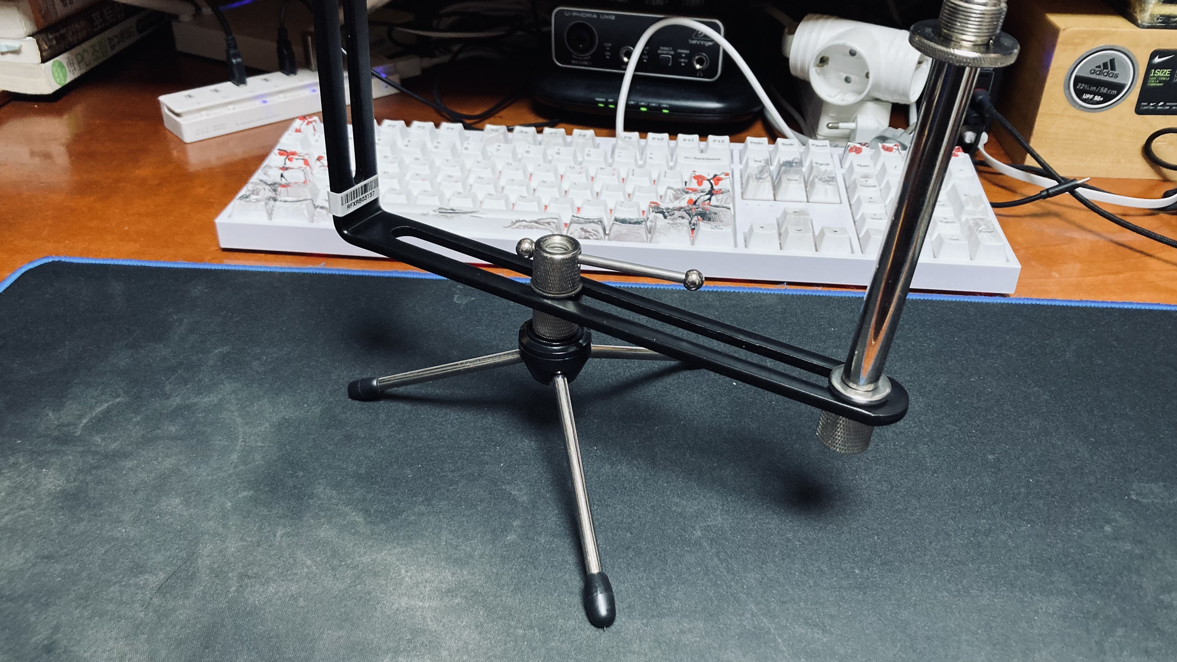 필자는 책상 위에다 리플렉션 필터를 설치할 생각이므로 작은 삼각형 스탠드를 가지고 왔다. 원래는 책상 위에 설치해 사용하는 굴절식 마이크 스탠드를 사용하려 했지만 RF-X 자체의 무게가 2.3KG 정도로 괘 무겁기 때문에 거치하는 순간 축 처질 건 당연지사다. 괜히 공식 홈페이지의 이미지들이 일반적인 스탠드에 연결해 사용하는지 알 거 같았다. 저 삼각형 스탠드, 크기는 작지만 생각보다 안정적이다.