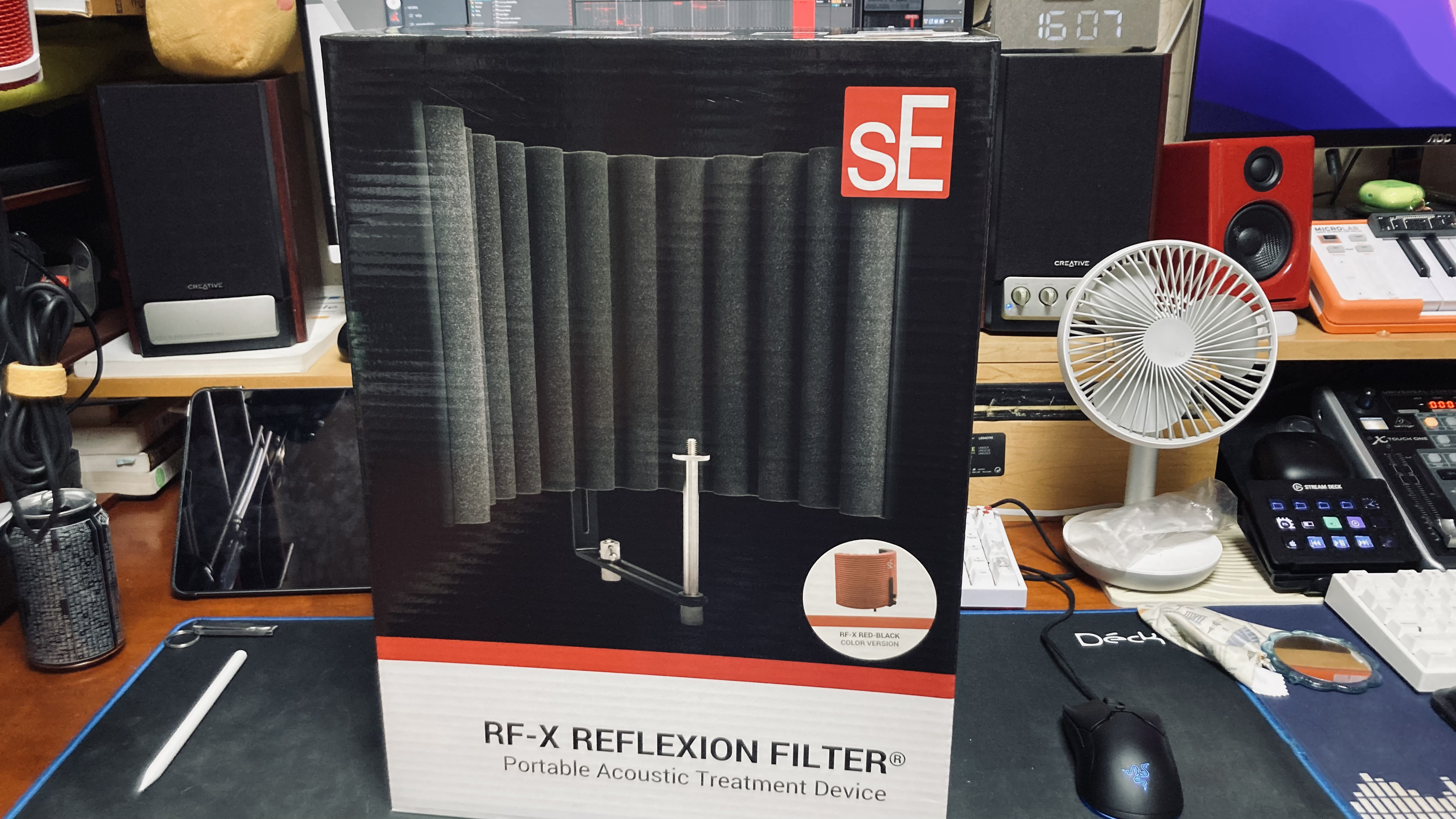 sE Electronics 사의 RF-X는 저가형으로 포지션 되었음에도 불구하고 괜찮은 장비다. 처음 박스에서 제품을 꺼내는 순간 한번 압도당하고, 힘겹게 조립을 마친 다음 마이크 앞에 설치하는 순간, 왠지 모르게 내 방이 스튜디오 녹음실이 된 거 같은 그러한 심리적인 든든함을 가져다준다. 든든함은 곧 자신감으로 연결되어 보다 적극적이면서 진심으로 음악을 대하는 내 자신을 발견할 수 있다. 비록 팟캐스트만 녹음하는 필자지만 팝 필터와 마찬가지로 레코딩적인 부분에서나 자신감을 가질 수 있는 부분에서나 도움이 되는 유용한 주변기기라 생각한다.
