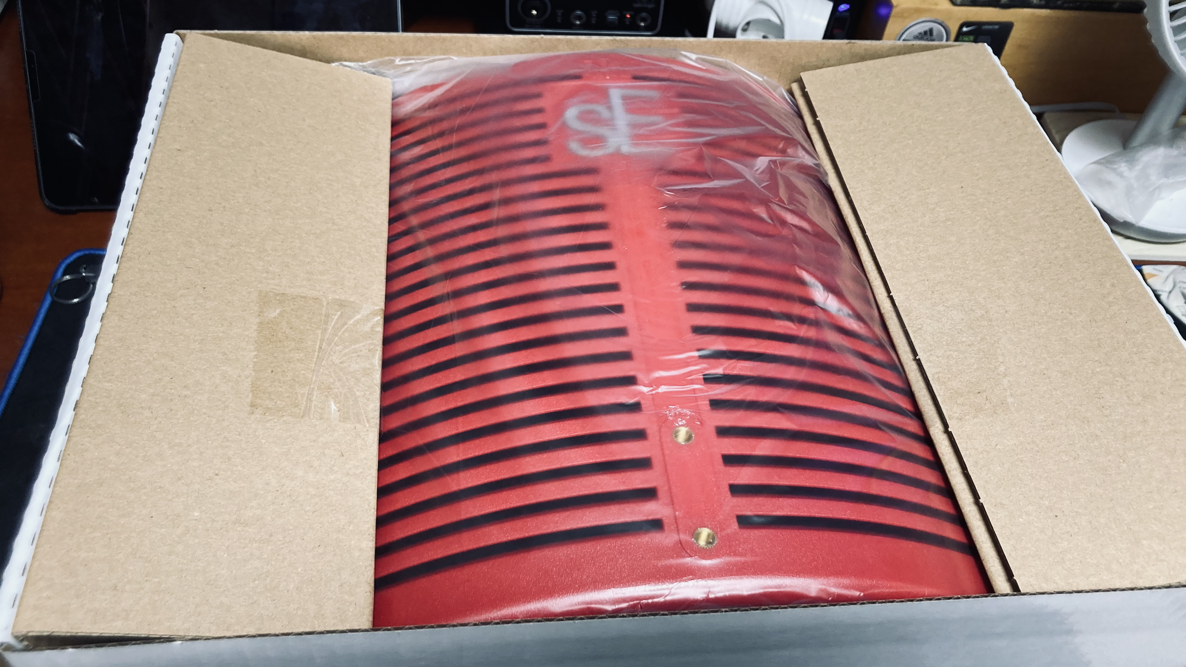 박스 양 옆에 테이프로 봉인된 박스를 열자 비닐에 쌓인 거대한 빨간 녀석이 정체를 드러냈다. "sE"라고 적힌 걸 봐선 오늘의 주인공, RF-X임에 틀림없다. 이제 보니 생각보다 스티커의 색이 원래 제품보다 조금 흐리게 나온 듯하다. 원래 제품 색은 정말 붉은색인데 위에서 봤듯 스티커의 색은 당근처럼 옅게 나왔다. 각설하고 본체는 나중에 천천히 살펴보고, 일단 박스 안의 구성품을 먼저 확인해볼까 한다.