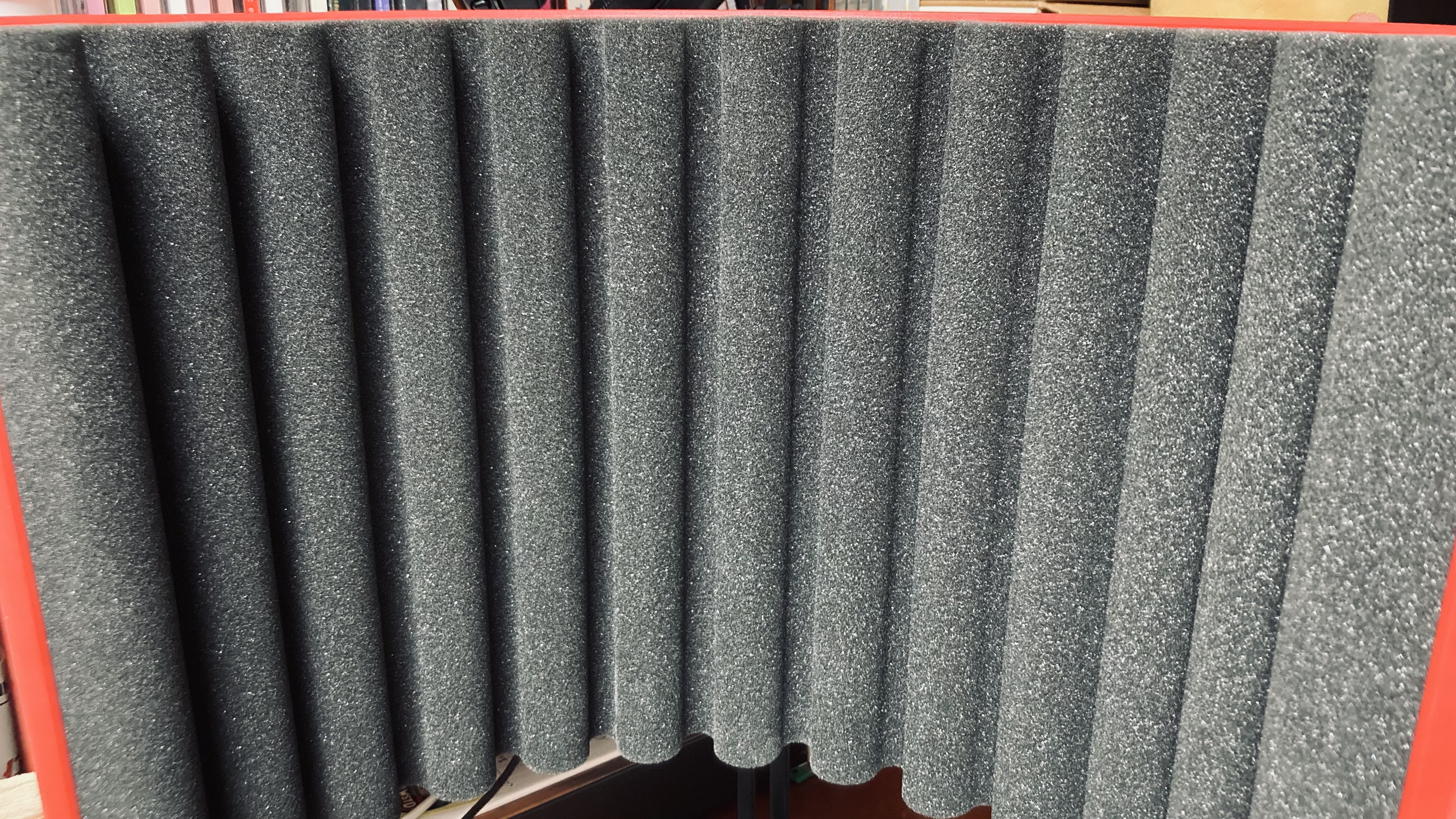 RF-X의 내부는 그냥 평범한 스펀지로 마감되어 있다. 저렴한 녹음실 하면 생각나는 그런 스펀지다. 리플렉션 필터라는 이름답게 소리의 분산에 초점을 맞춰 일정 간격으로 스펀지가 굴곡져 있다. 마감 자체는 깔끔한 편이다. 적당히 볼륨감 있으면서도 복구력도 좋다. 조금 더 복잡한 패턴이었다면 좋지 않았을까 하는 생각은 있다. 지금 패턴 역시 보여주려는 느낌이 없지 않아 있는데 이 요소를 좀 더 극대화했다면 어땠을까.