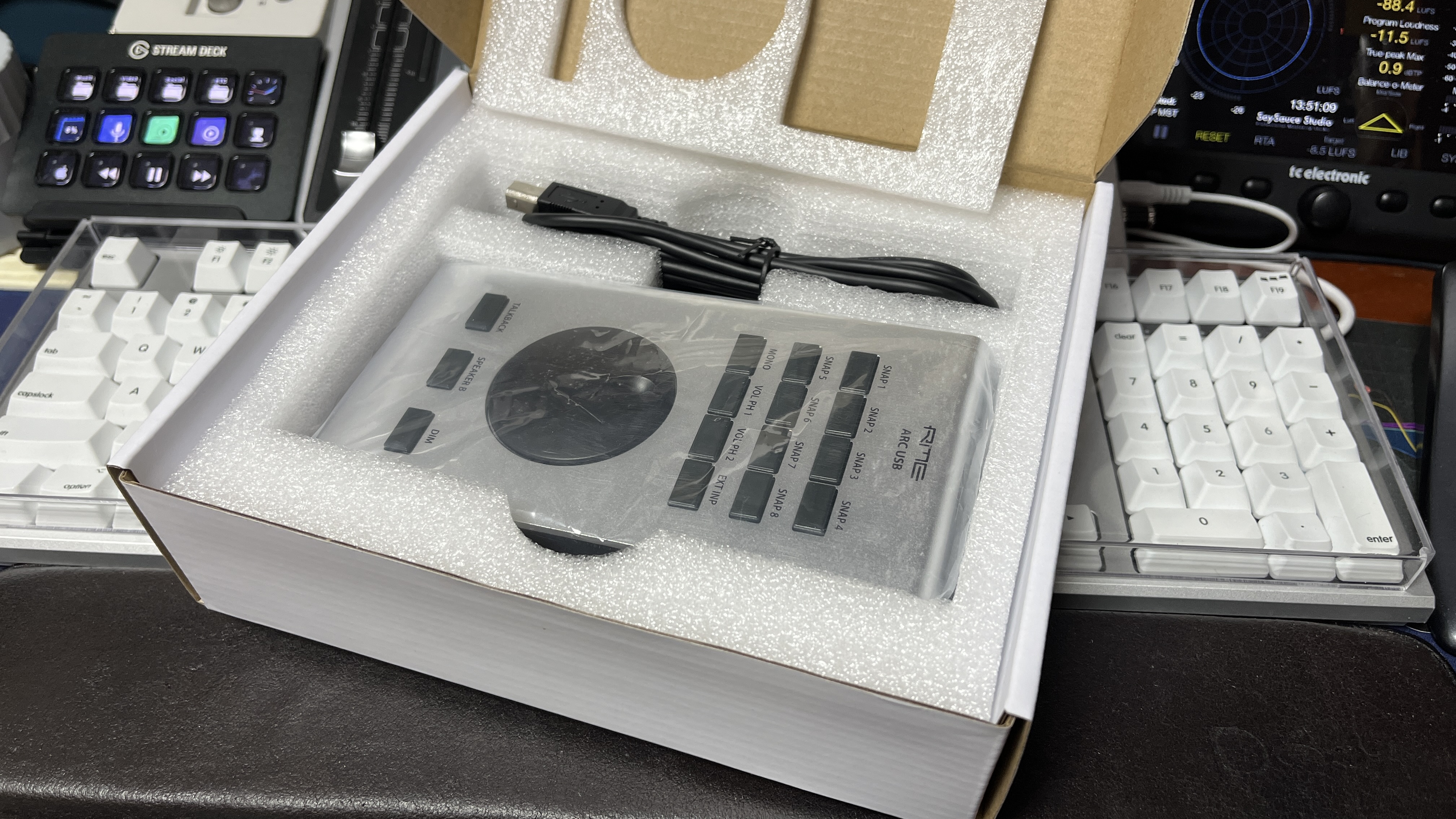얇은 폼을 들어내니 오늘의 주인공, ARC USB 본체와 케이블이 모습을 드러냈다. 이것도 꺼내서 깔끔하게 정리해보고자 한다.