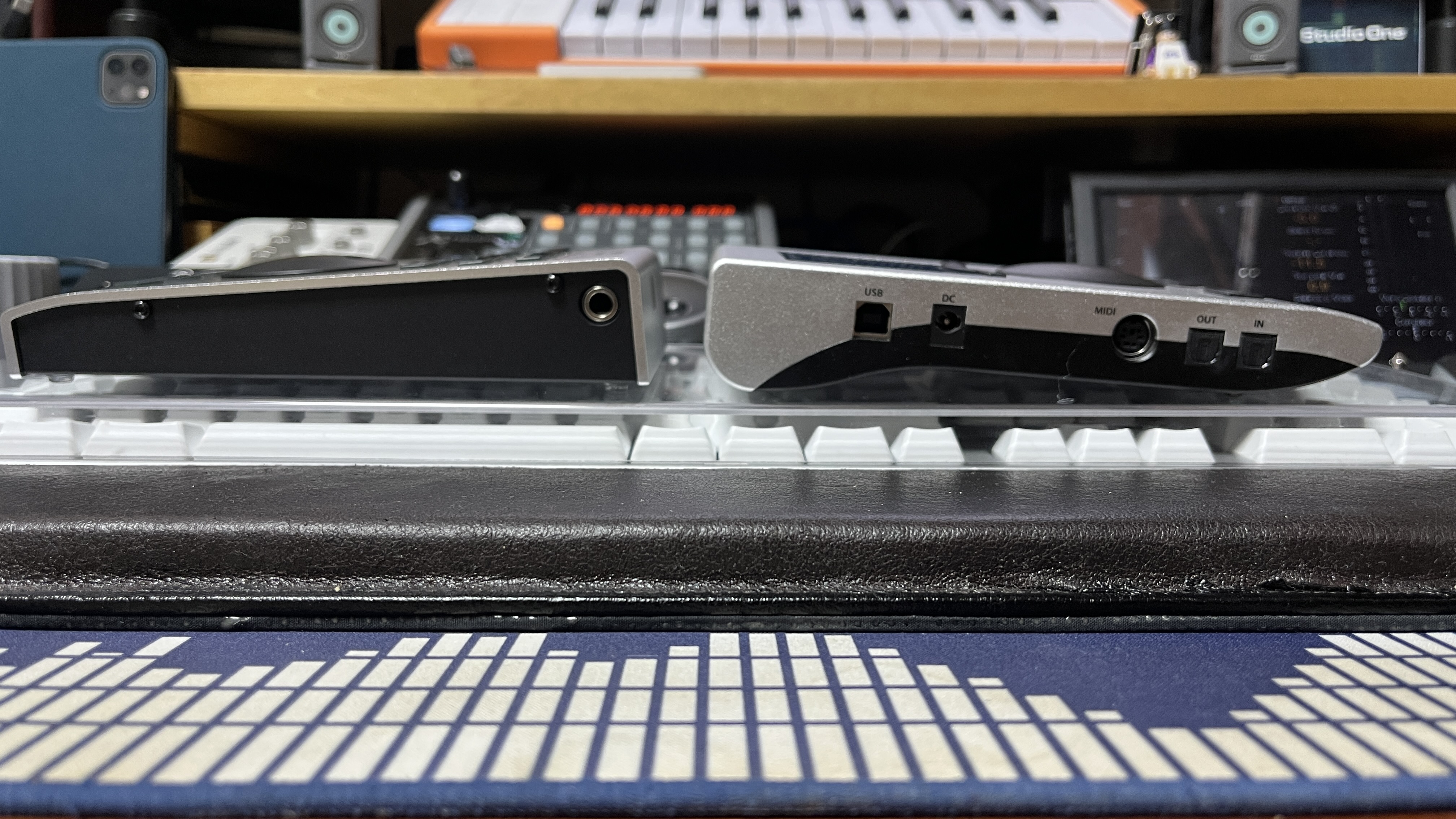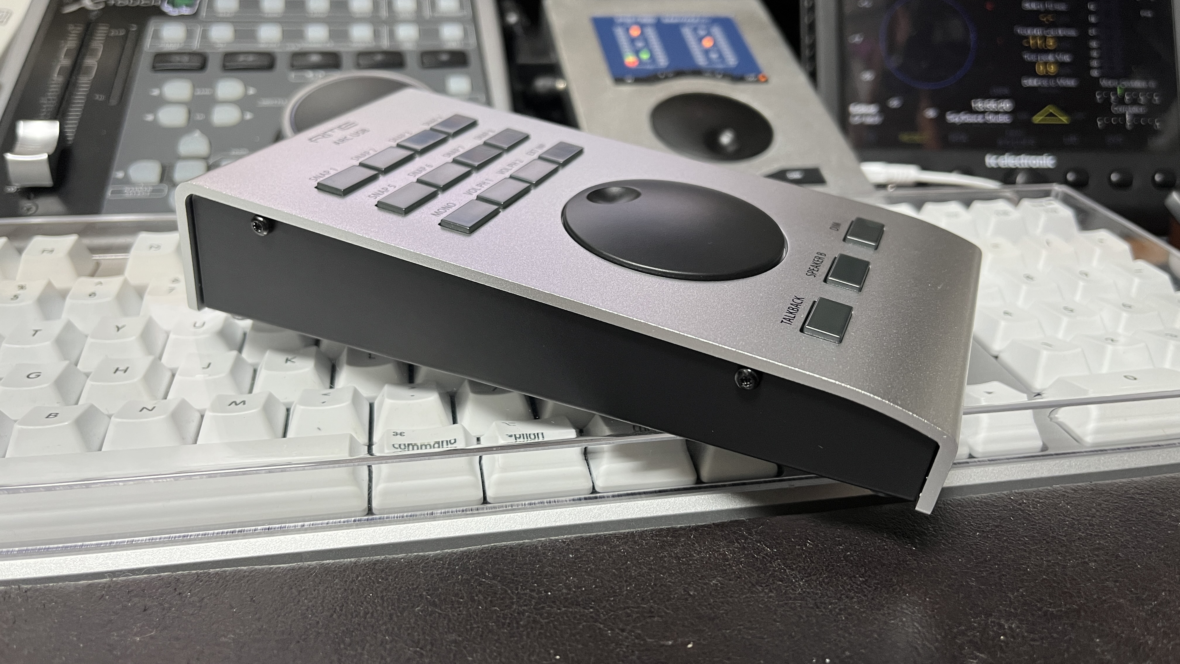 좌측에서 보면 더더욱 유사점이 보인다. 각도도 거의 동일하고, 소재도 동일하다. 문득 든 생각인데, 옆 회사인 UAD는 Apollo Twin 시리즈를 UAD 랙 오디오 인터페이스에 연결하면 볼륨 컨트롤러로 사용할 수 있다고 한다. Babyface Pro도 자사 제품에 연결했을 때 볼륨 컨트롤러로 사용하게끔 해 줬으면 좋을 듯하다. 물론 통신 규격상의 문제로 힘들겠지만 말이다.