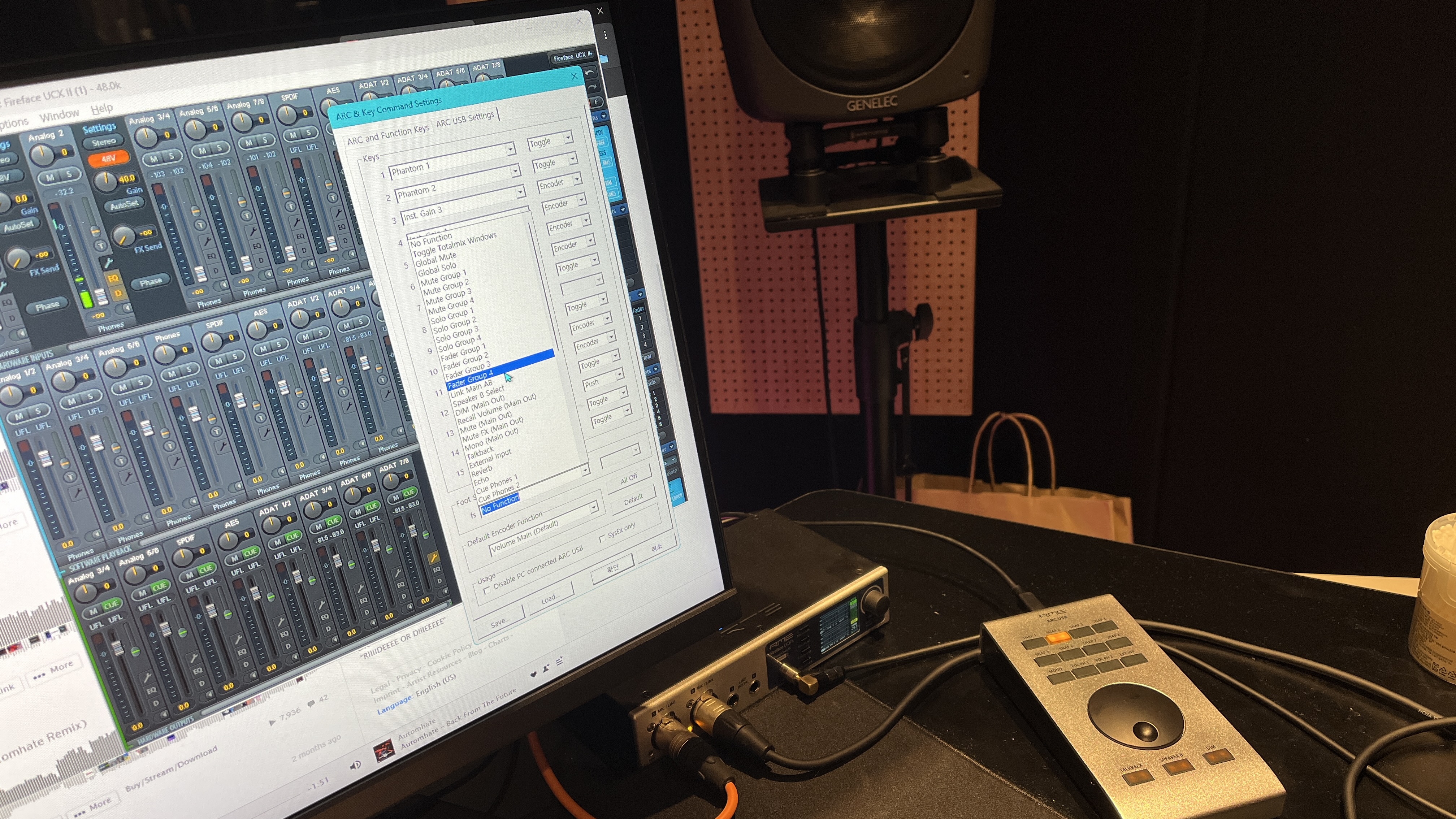 세팅은 부드럽고 신속하게 이루어졌다. 필자가 들고 간 ARC USB를 Fireface UCX2 뒷면의 DURec USB 포트에 연결하자 별다른 설정 없이도 ARC USB 기본 세팅이 자동으로 로딩되었다. 이 상태에서도 특별한 설정 없이도 UCX2의 TotalMix FX를 제어할 수 있었다. 여기에 UCX2를 위한 약간의 ARC USB 기능 커스텀을 더하자, 생각 이상으로 훌륭한 시스템이 완성되었다. 필자의 지인은 작은 레코딩 룸을 운영하고 있는데, 최대한 저렴한 비용으로 레코딩 룸과 토크백 마이크 구성을 위해 UCX2를 선택했다고 한다. 그러나 ARC USB의 존재는 모르고 있었기에 이번 기회에 살포시 영업을 진행했다. 덤으로 TotalMix 리모트 컨트롤과 DIGICheck 사용법을 알려주고, ARC USB 프리셋 파일과 구매 링크를 남기고 왔으니 가까운 시일 내에 완벽한 RME맨으로 전직할 거 같은 눈빛을 띄었다. 오늘도 영업 성공이다.