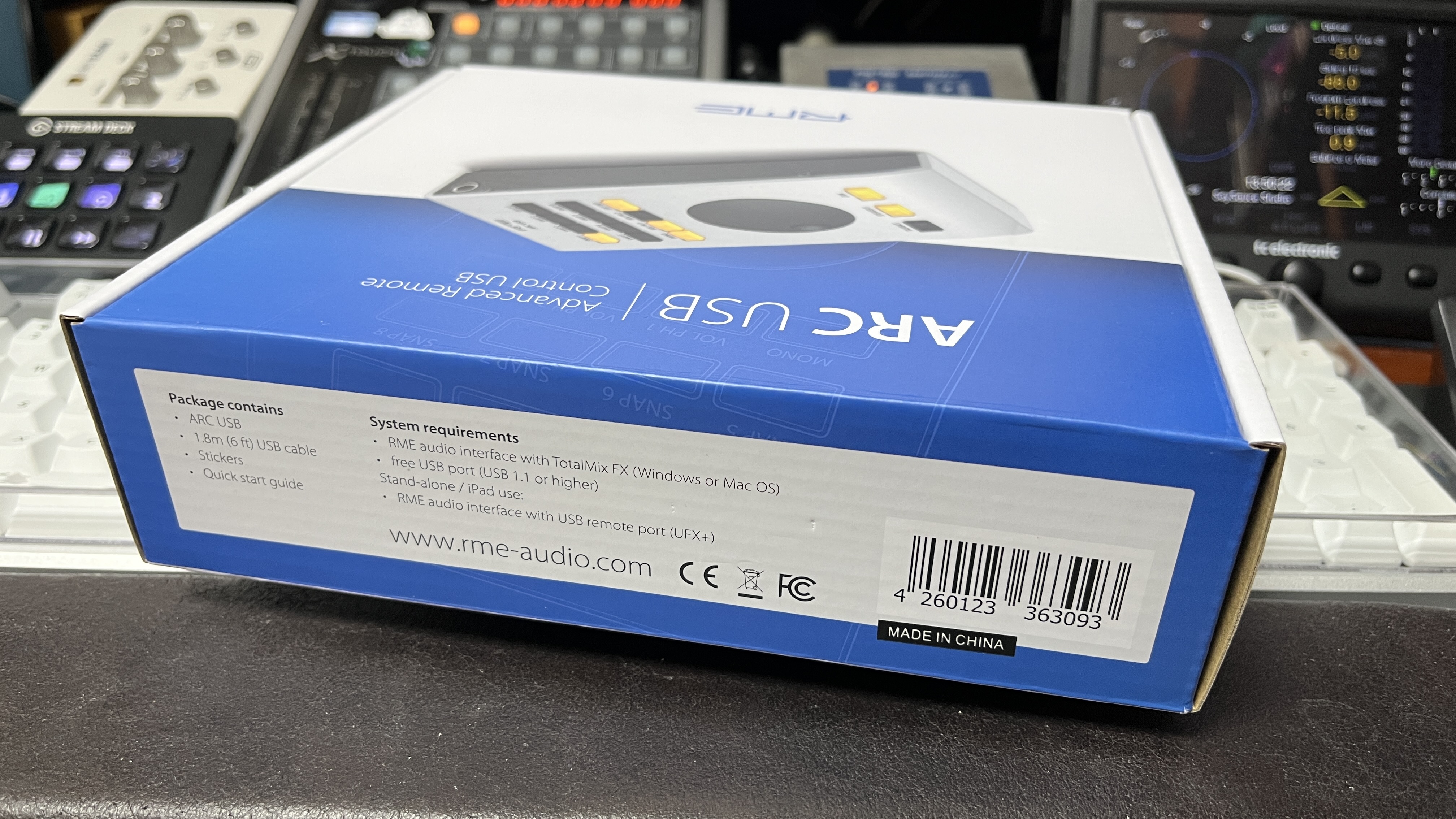 박스의 위쪽에는 RME ARC USB를 작동하기 위한 최소한의 사양 및 박스 안에 들어 있는 구성품 리스트가 인쇄되어 있다. UPC 번호 및 제조 국가도 여기에 있는데 의외로 Made In China다. 역시 제조업에서 중국을 빼놓을 수는 없는 건가 라는 생각이 다시금 들었다.