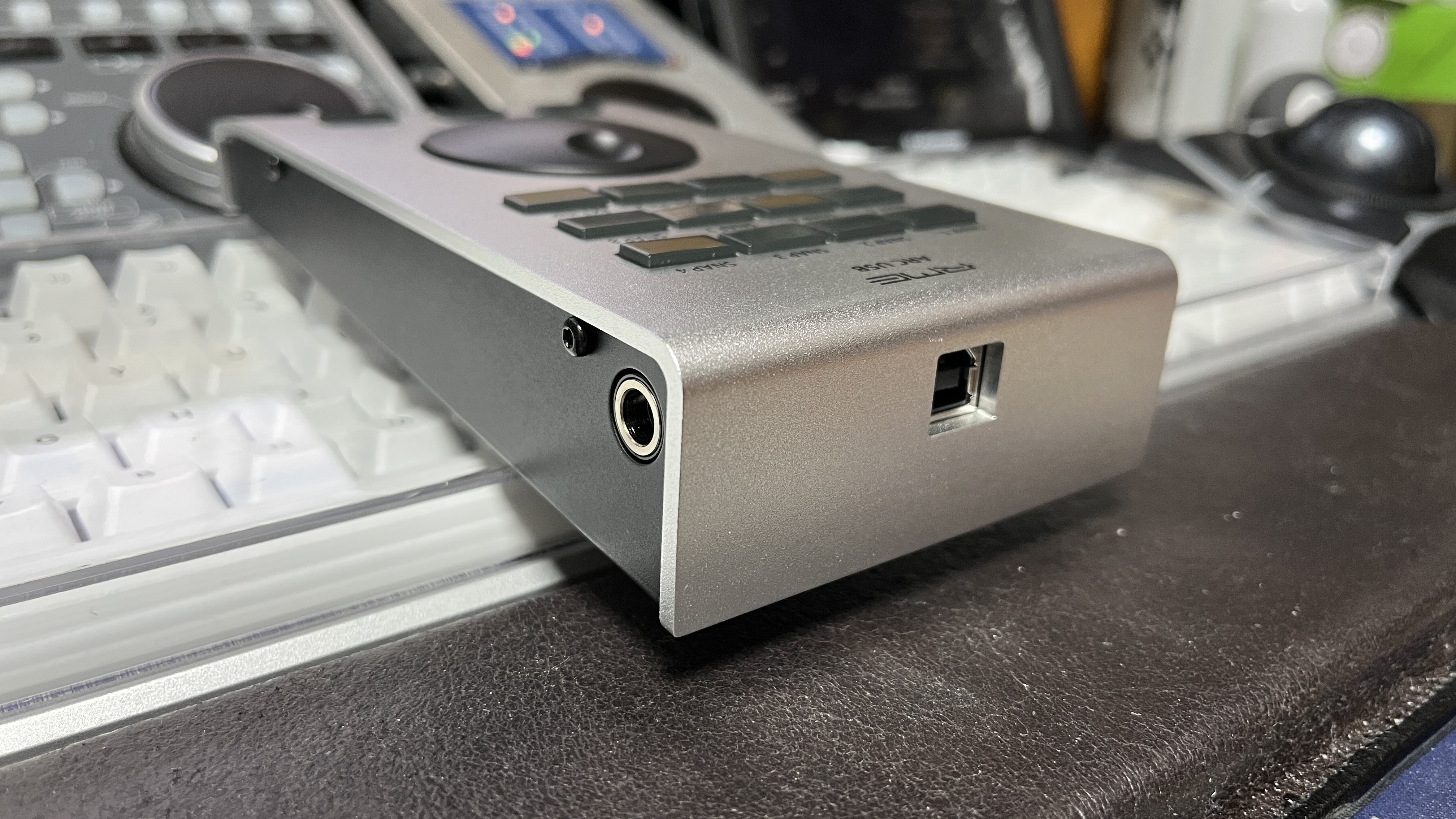 구성품들을 다 살펴봤으니 이제 ARC USB 본체를 살펴볼 차례다. 이야기만 수없이 들었지, 실제로 보는 ARC USB는 생각 외로 묵직하고 고급스러웠다. 부드러운 촉감의 알루미늄과 거대한 인코더 노브, 그리고 구분감 있는 버튼들이 인상적이다. 버튼은 매끈한 플라스틱으로 되어 있다. 반투명한 소재로 되어 있어 전원을 넣으면 버튼 뒤의 LED에 불이 들어온다. 의외로 버튼의 완성도가 좋지 못하다고 느꼈는데, 버튼들이 흔들린다. 약간의 단차가 있는 듯하다. 그래서 ARC USB를 흔들면 버튼들이 흔들리는 소리가 들린다. 명확한 버튼 구분감을 위해 단차를 일부러 준 건지, 아님 QC 문제인지 잘 모르겠다. 또한 버튼 근처에 인쇄된 기능 키들의 인쇄 상태가 썩 좋지 않다. 알루미늄에 음각으로 새겨져 있는 게 아닌, 레이저로 인쇄되어 있는 거라
