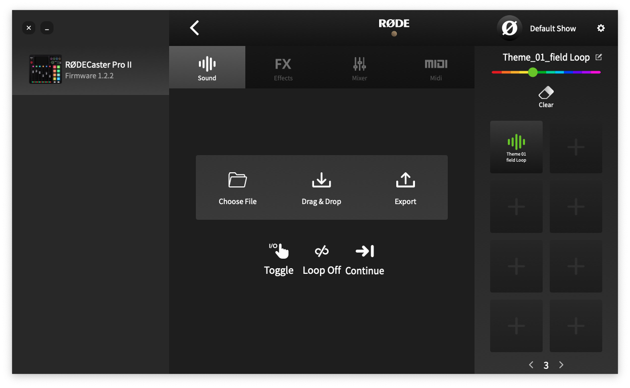 샘플을 스마트 패드에 넣는 방법은 간단하다. 매핑하고 싶은 스마트 패드 슬롯을 선택한 후, Choose File을 눌러 파일을 고르거나, 드래그 드랍으로 파일을 던져 넣으면 선택한 슬롯에 샘플이 들어간다. 다만 RøDECaster Pro II 내부 설정에서 지원하던 시적점 및 끝점을 설정하는 건 지원하지 않는다. 추후 RøDE Central 업데이트로 샘플 길이 편집도 지원해 줬으면 좋겠다.