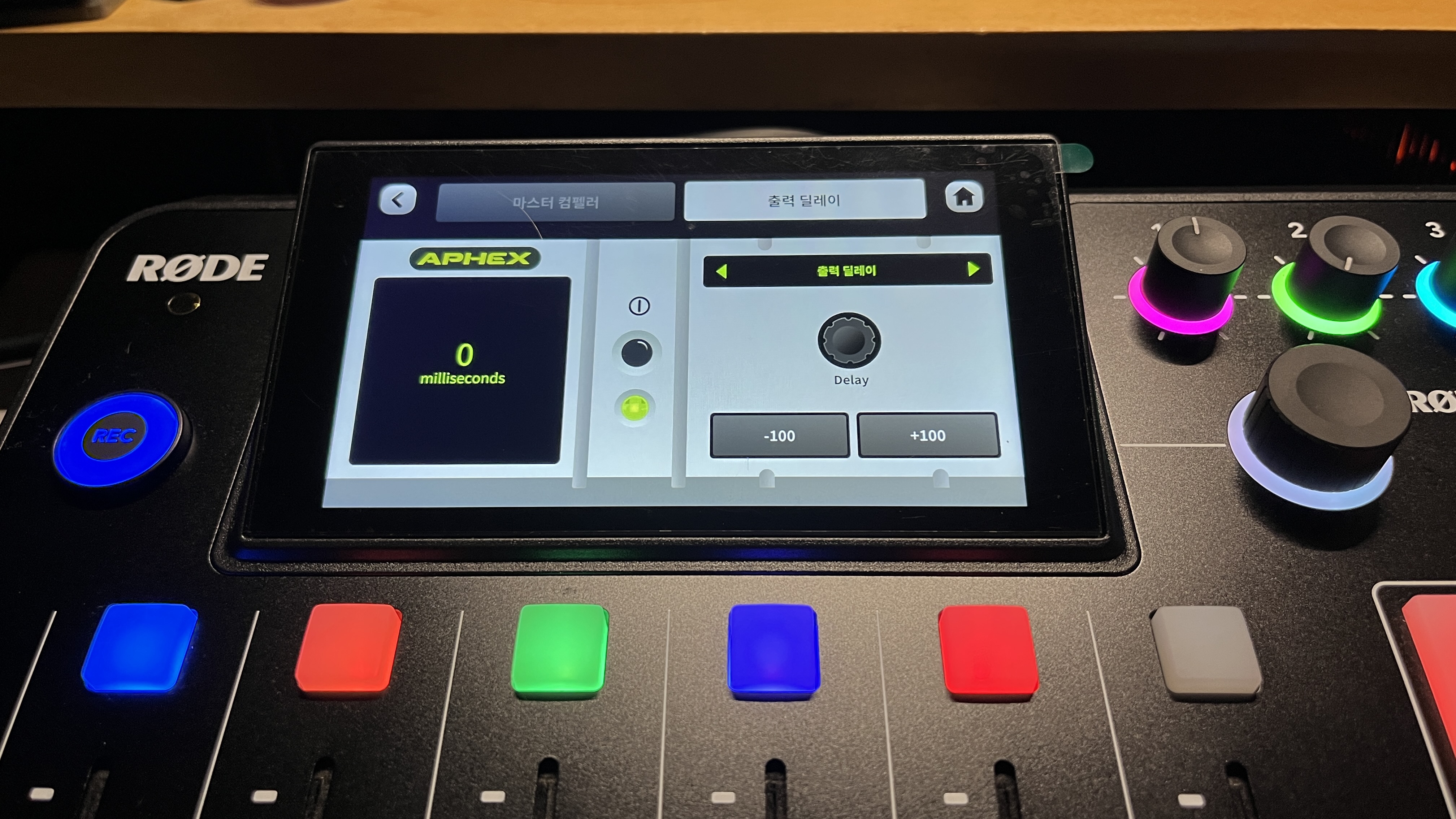 컴프레서 옆에 있는 건 출력 딜레이다. 출력 딜레이라는 표현이 조금 이상한데, 일반적인 아웃풋 딜레이다. 딜레이가 마스터 단에 있는 이유가 조금 의아할 텐데, 청자가 가까이 있는 상태에서 레코딩 및 라이브 방송을 진행할 때에는 별 문제가 안 돼지만 인터넷상에 대부분의 청자가 있다면 네트워크 신호 및 컴퓨터의 처리 등으로 인해 지연이 발생할 수 있다. 이런 경우 방송 모니터링 시 방금 말했던 내용이 약간 뒤에 출력되어 의도치 않은 딜레이 이펙터를 건 것처럼 들리게 된다. 그럴 때 출력 딜레이로 지연된 만큼 보정을 한다면 의도치 않은 딜레이를 방지할 수 있다. 거대한 공연장의 경우 이러한 출력 딜레이가 필수적으로 적용된다. RøDECaster Pro II에 이게 있는 게 신기하다.