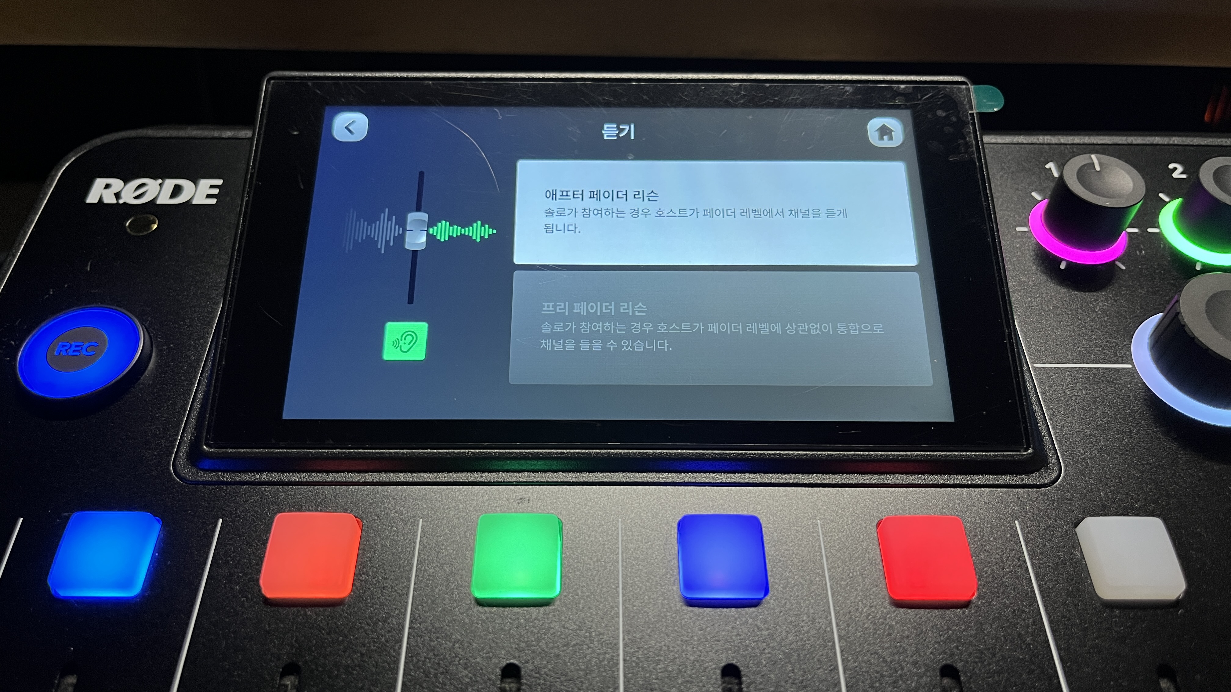 듣기 설정에서는 솔로 버튼을 눌렀을 때의 설정을 할 수 있는데, 프리 페이더로 들을지, 아니면 애프터 페이더로 들을지 선택할 수 있다. 아마 DAW를 만져봤던 사람이라면 낯익을 수 있는 옵션이다. 프리 페이더는 페이더의 위치를 무시하고 소리를 재생한다. 예를 들어 음악이 나오는 컴퓨터 1번 채널을 페이더를 맨 밑으로 내린 후 솔로 버튼으로 듣는 경우에, 애프터 페이더 옵션으로 설정했다면 솔로 버튼을 눌러도 음악이 헤드폰으로 들리지 않을 것이다. 그러나 프리 페이더 옵션으로 설정되어 있다면 페이더는 내려가 있지만 정상적으로 컴퓨터 1번 채널을 헤드폰으로 들을 수 있다. 프리 페이더와 애프터 페이더는 상황에 따라 다르게 활용되기에 필요할 때마다 전환하면 좋다.