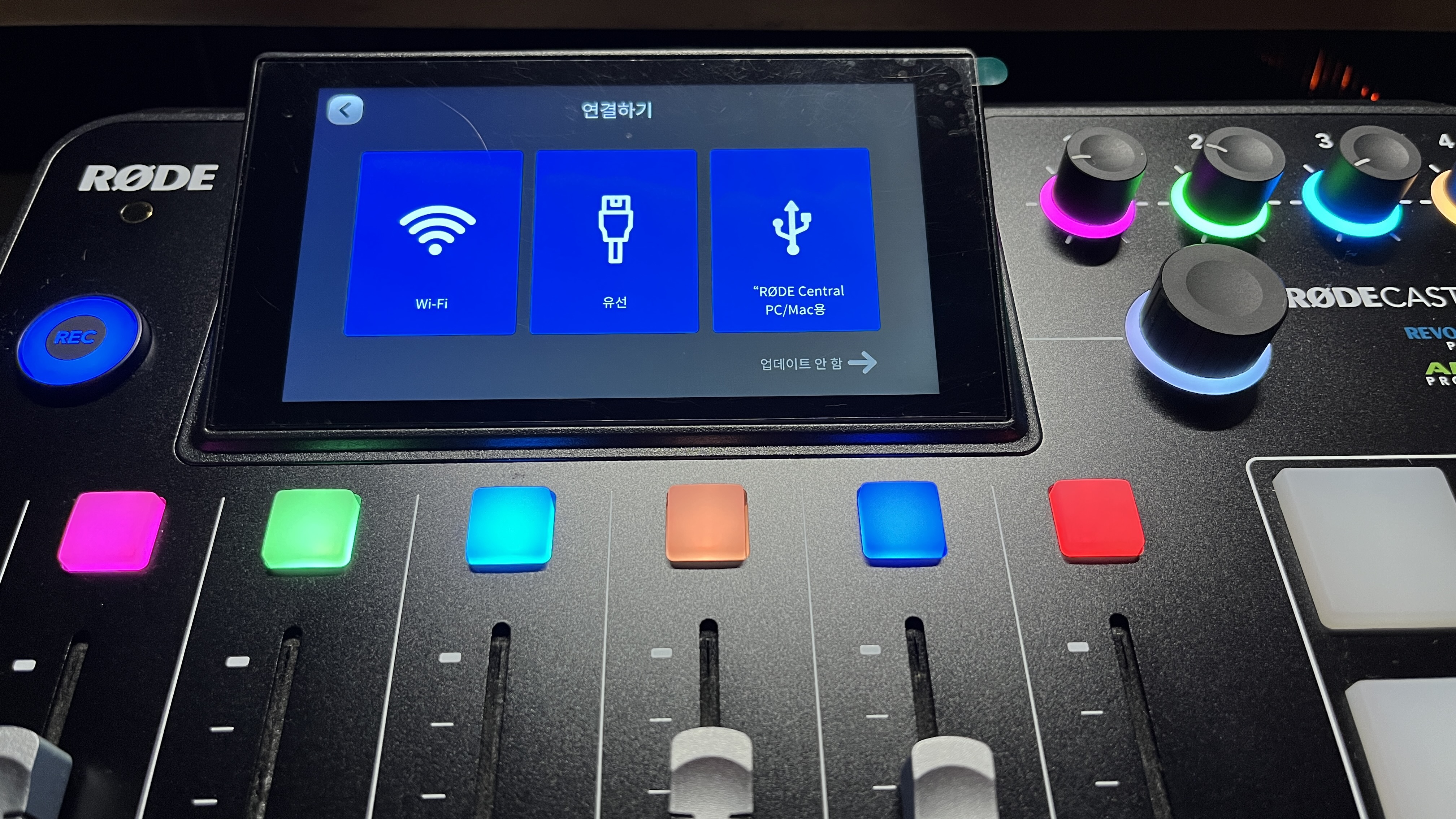 날짜 및 시간 설정이 끝났다면 인터넷 접속 여부를 묻는다. RøDECaster Pro II는 오디오 인터페이스가 아닌 디지털 믹서인지라 Wi-Fi나 랜 포트를 통해 자동 펌웨어 업데이트 등을 지원한다. 또한 컴퓨터에 연결해서 전용 프로그램 "RøDE Central"을 통해 펌웨어 업데이트를 할 수 있다. 필자는 추후 컴퓨터에 직접 연결할 예정이므로 "업데이트 안 함"을 선택하여 다음으로 넘어갔다. 어차피 네트워크 설정은 나중에 다시 할 수 있다.