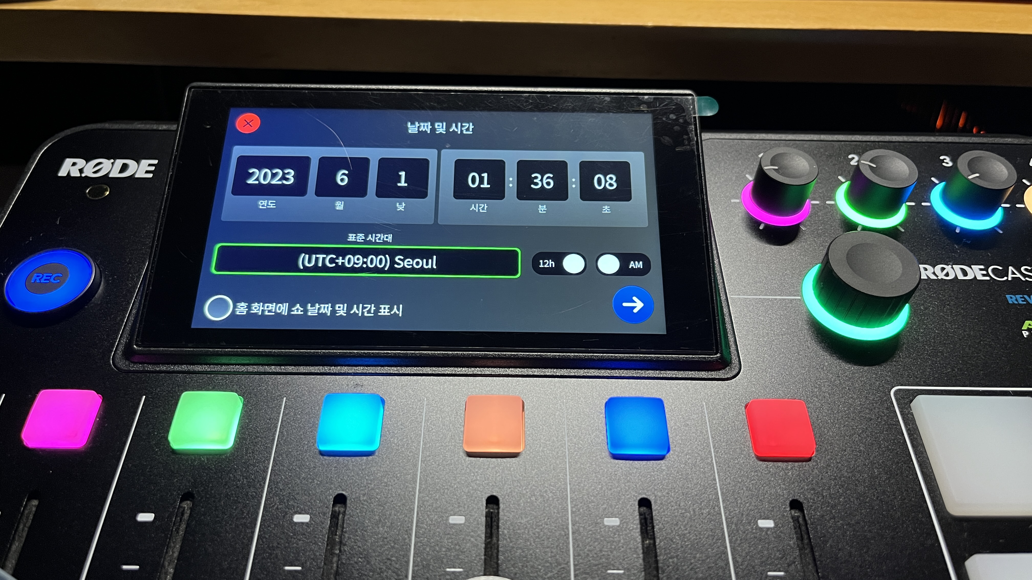 언어 설정이 끝났다면 이제 시간 설정을 할 차례다. 시간 설정을 꼭 해야 하나?라는 의구심이 들 수도 있지만, 팟캐스트 레코딩이나 라이브 방송 시 시간이 매우 중요한 요소임을 생각한다면 되도록 정확한 시간으로 맞춰주는 것이 좋다. 기본적으로 터치로 조작하며, 24시간 옵션 및 AM/PM 설정, 표준 시간대 설정 등을 추가로 할 수 있다. 아래에 있는 "홈 화면에 쇼 날짜 및 시간 표시"는 이후 설정이 끝나면 시간을 홈 화면에 보일 건지의 여부를 결정하는 기능이다. 추후 끌 수도 있으니 일단은 켜고 다음으로 진행하겠다.