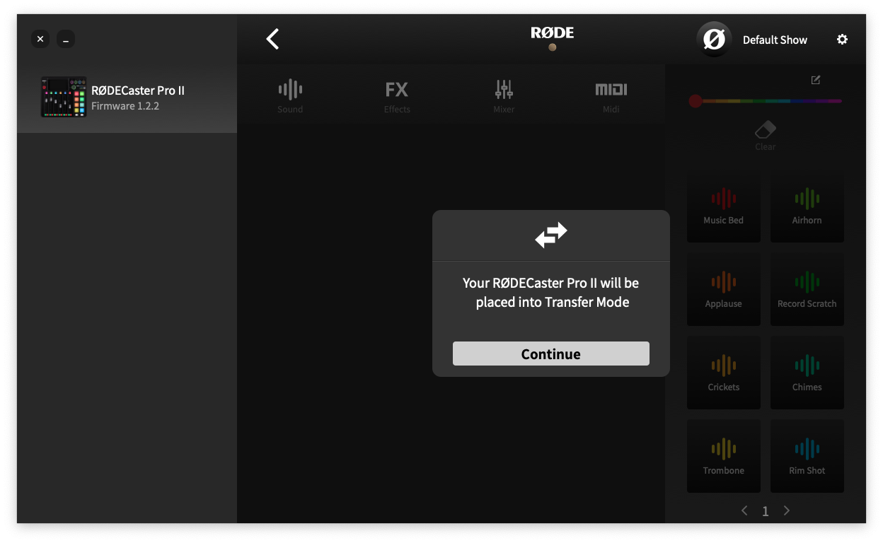 위에서 RøDECaster Pro II 내부 설정으로는 스마트 패드에 새로운 샘플들을 추가할 수 없다고 언급한 바 있다. 하지만 RøDE Central을 이용한다면 스마트 패드에 새로운 오디오 샘플들을 넣을 수 있다. 그전에 RøDECaster Pro II를 전송 모드로 전환할 필요가 있다. 화면의 Continue 버튼을 누르면 자동으로 RøDECaster Pro II가 전송 모드로 들어간다.