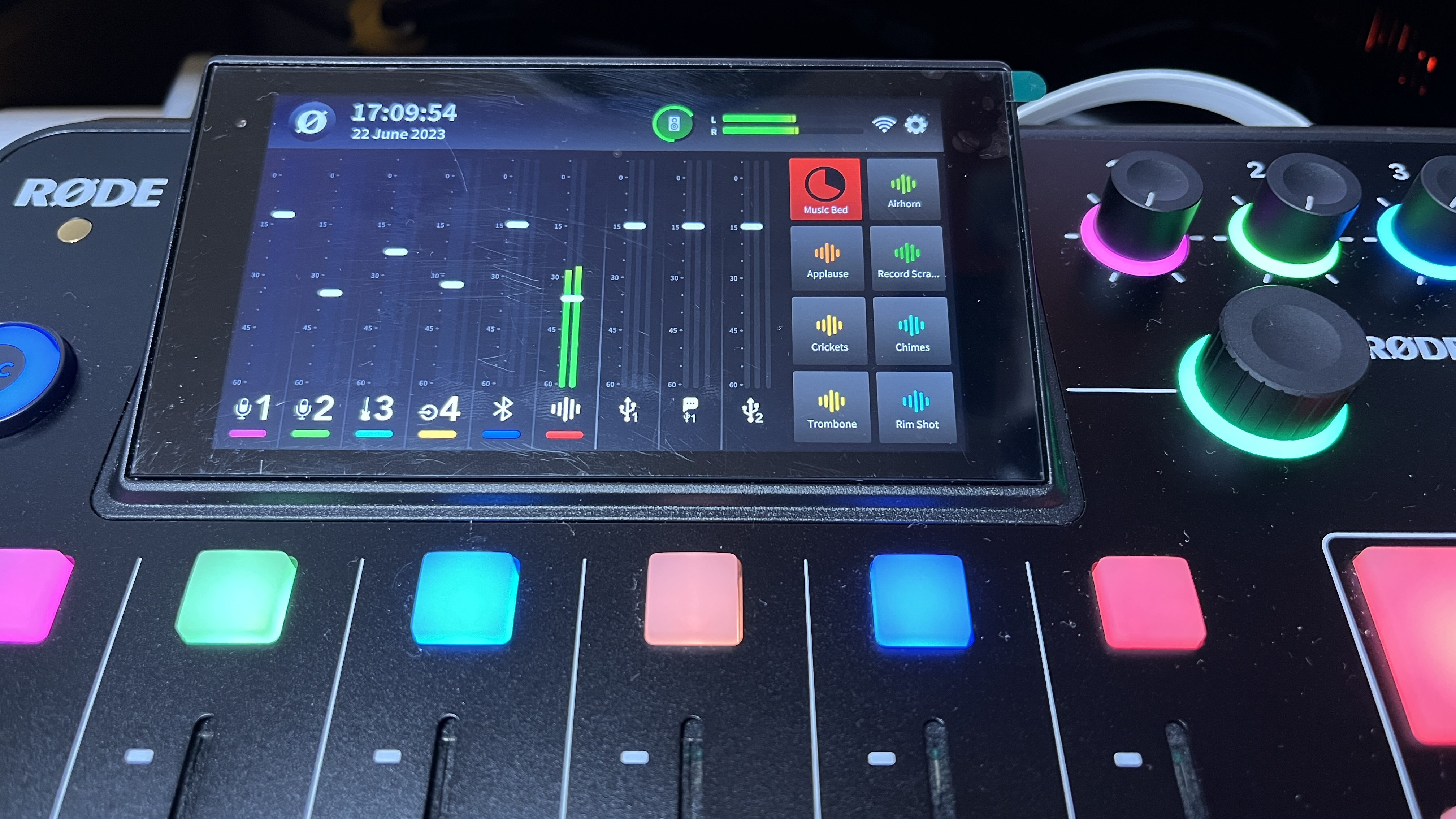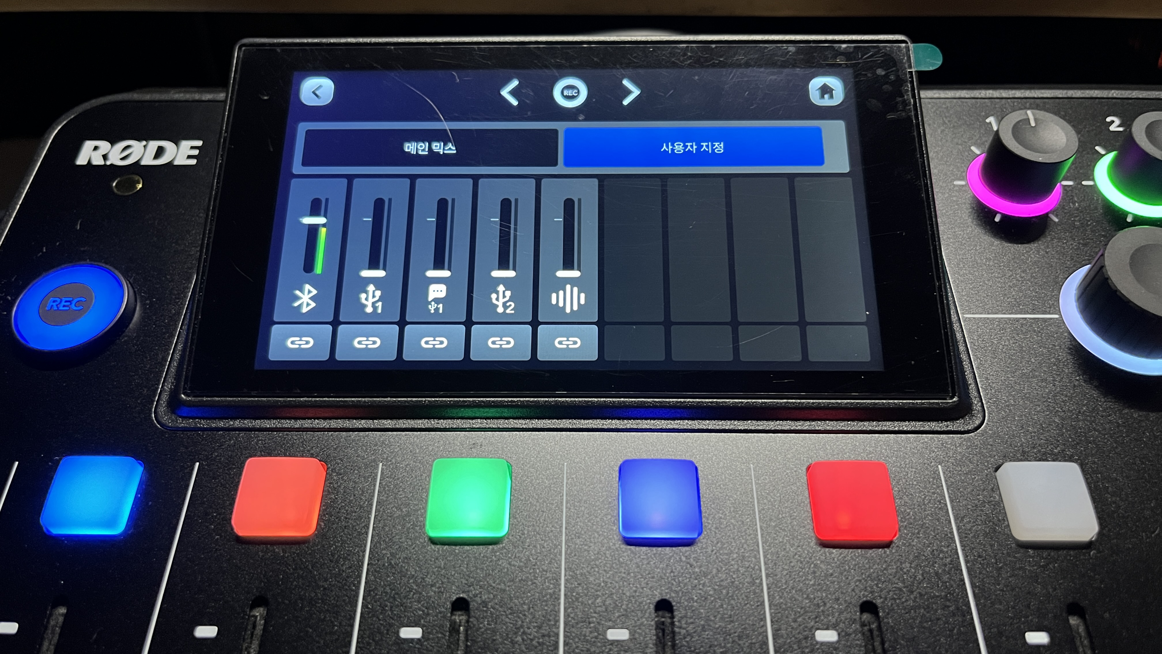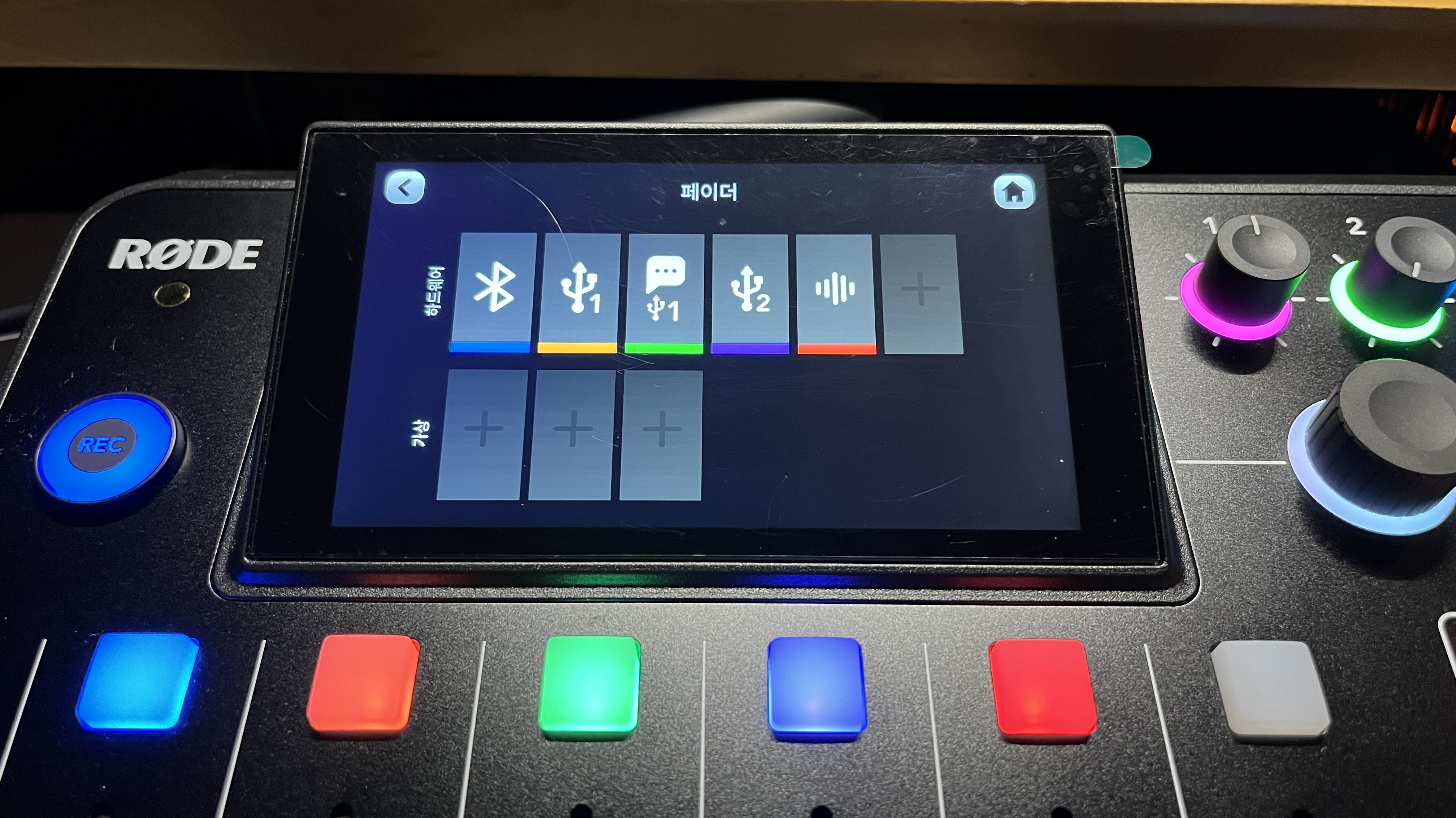 RøDECaster Pro II를 박스에서 따로 꺼내 보았다. 6개의 페이더와 거대한 디스플레이, 우측 상단의 노브들, 우측의 패드가 가장 먼저 눈에 들어온다. 상단의 디스플레이는 터치를 지원한다. 크기는 스마트폰 디스플레이보다 살짝 큰 편이라 시인성이 좋다. 디스플레이 하단에는 6개의 페이더와 채널 선택 버튼이 있다. 페이더들은 모터 페이더는 아니지만 꽤 좋은 품질이다. 상하로 움직일 때 적당히 묵직하면서도 고정력이 좋다. 우측의 패드는 물리적으로 눌리는 방식이 아닌 고급형 모델에서 볼 수 있는 딱딱한 방식이다. 오래 두드린다면 손가락에 피로는 쌓이겠지만 내구성 하나는 좋다. 페이더들 하단에는 솔로 및 채널 뮤트 버튼들이 있다. 솔로 및 뮤트 버튼은 DAW들을 많이 사용해 본 사람이라면 익숙한 개념이다. 그것들과 동일한 기능이다.