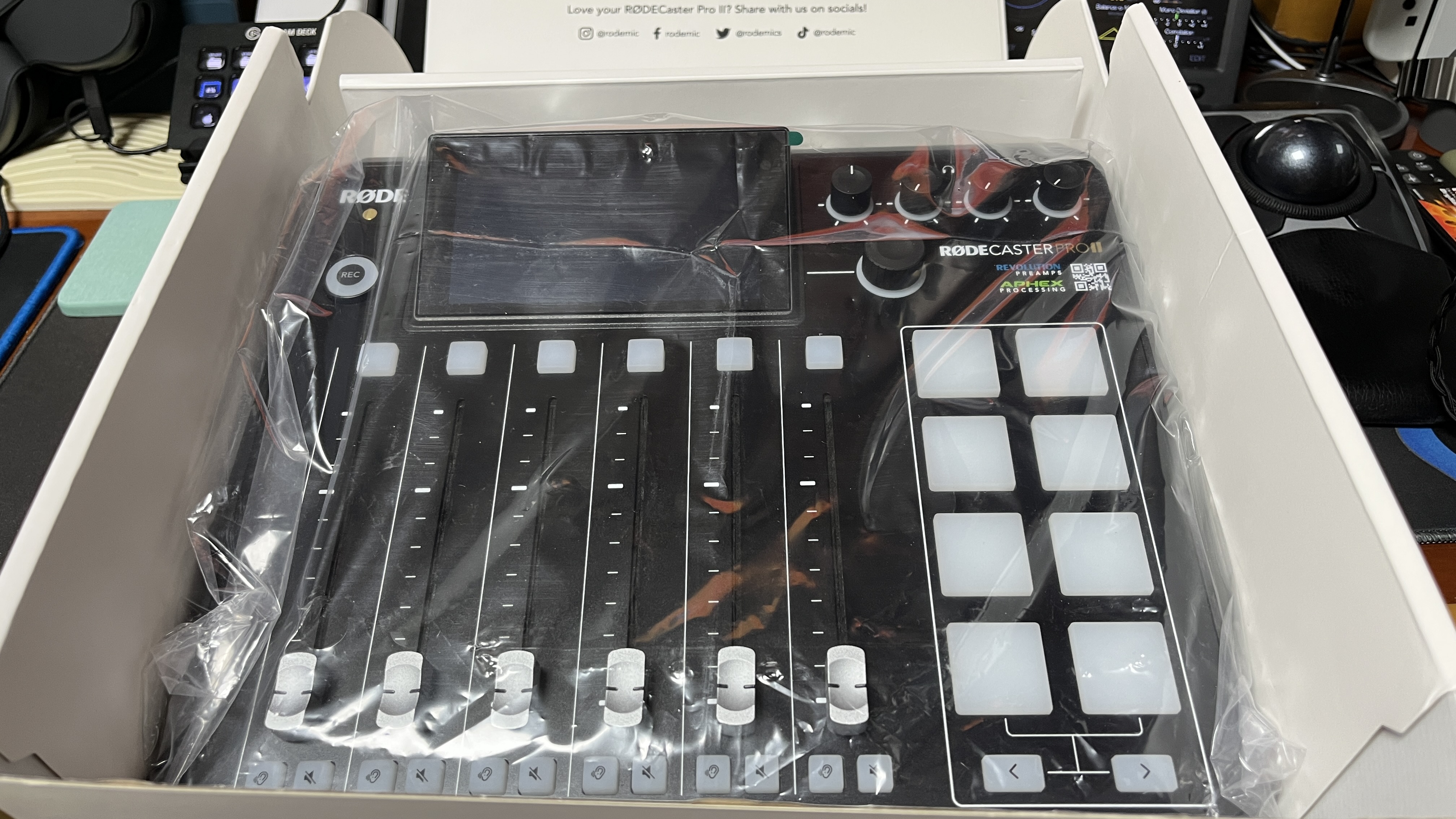 도발적인 문구가 인쇄되어 있는 가이드를 들어내면 비닐에 싸여 있는 오늘의 주인공, RøDECaster Pro II 본체의 모습이 나타난다. 필자의 예상보다 큰 사이즈를 가지고 있어서 적잖이 놀랐다.